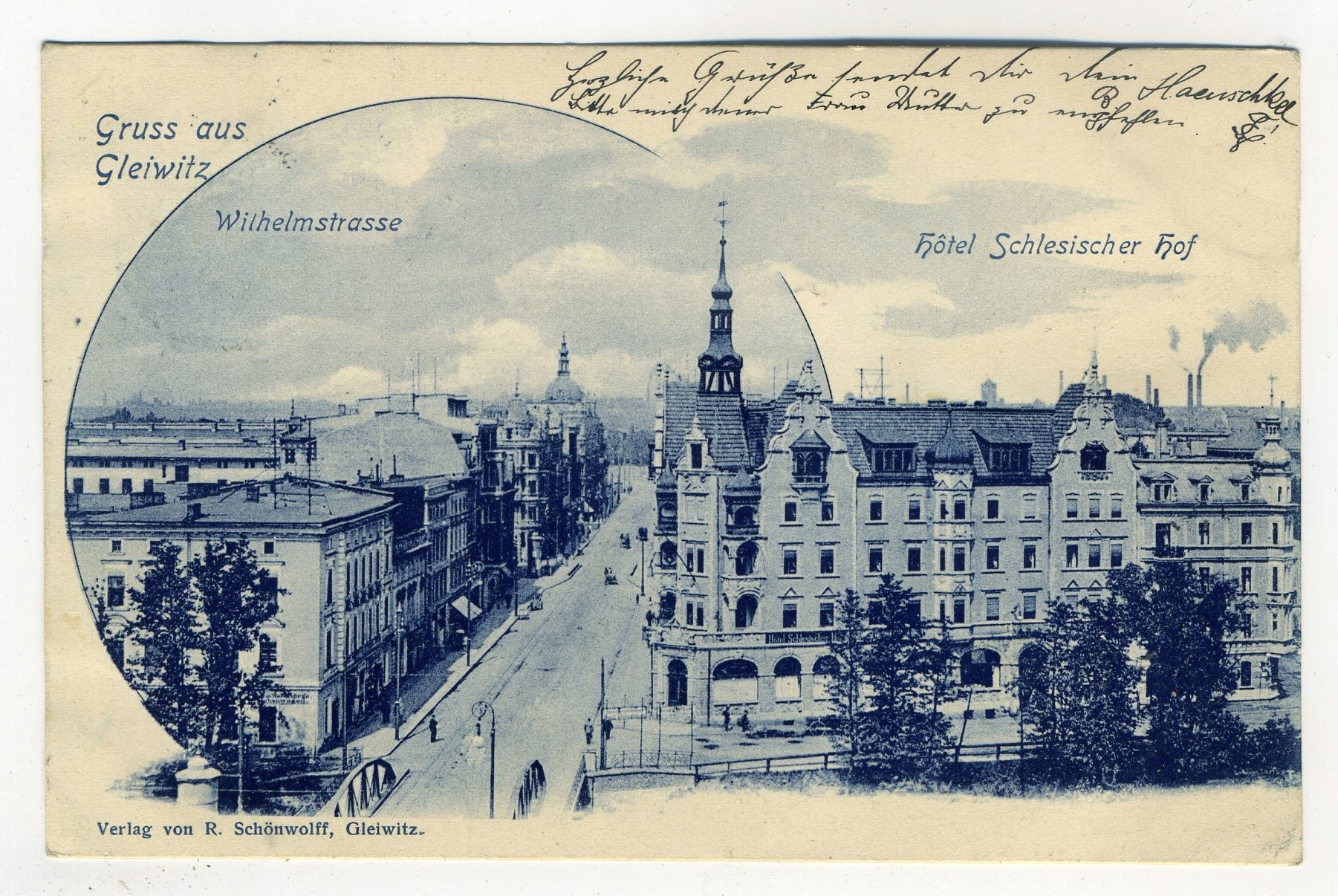 сьогодні на аукціоні листівка з Глівіце - колишньої Вільгельмштрассе та готелю Schlesischer Hof, нині вулиця Zwycięstwa, готель "Diament", надіслано, 1899 р., у дуже хорошому стані - (невеликі враження в альбомі).