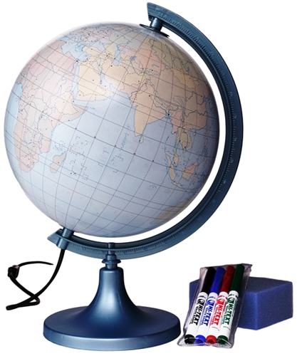 На поверхні глобуса можна писати маркерами, які стираються, як на традиційній білій шкільній дошці. Набір фломастерів і губка-гумка входять БЕЗКОШТОВНО!