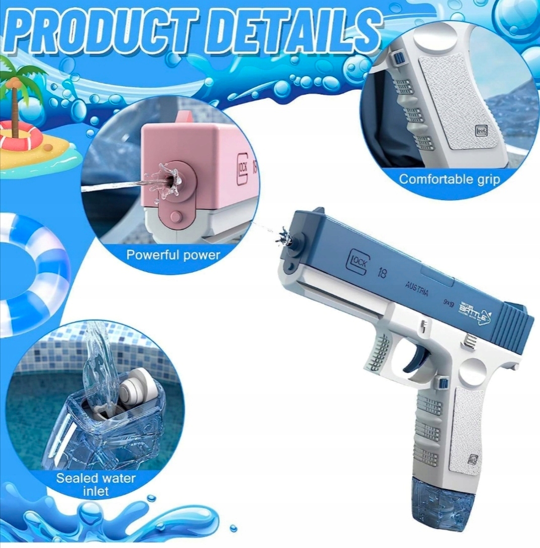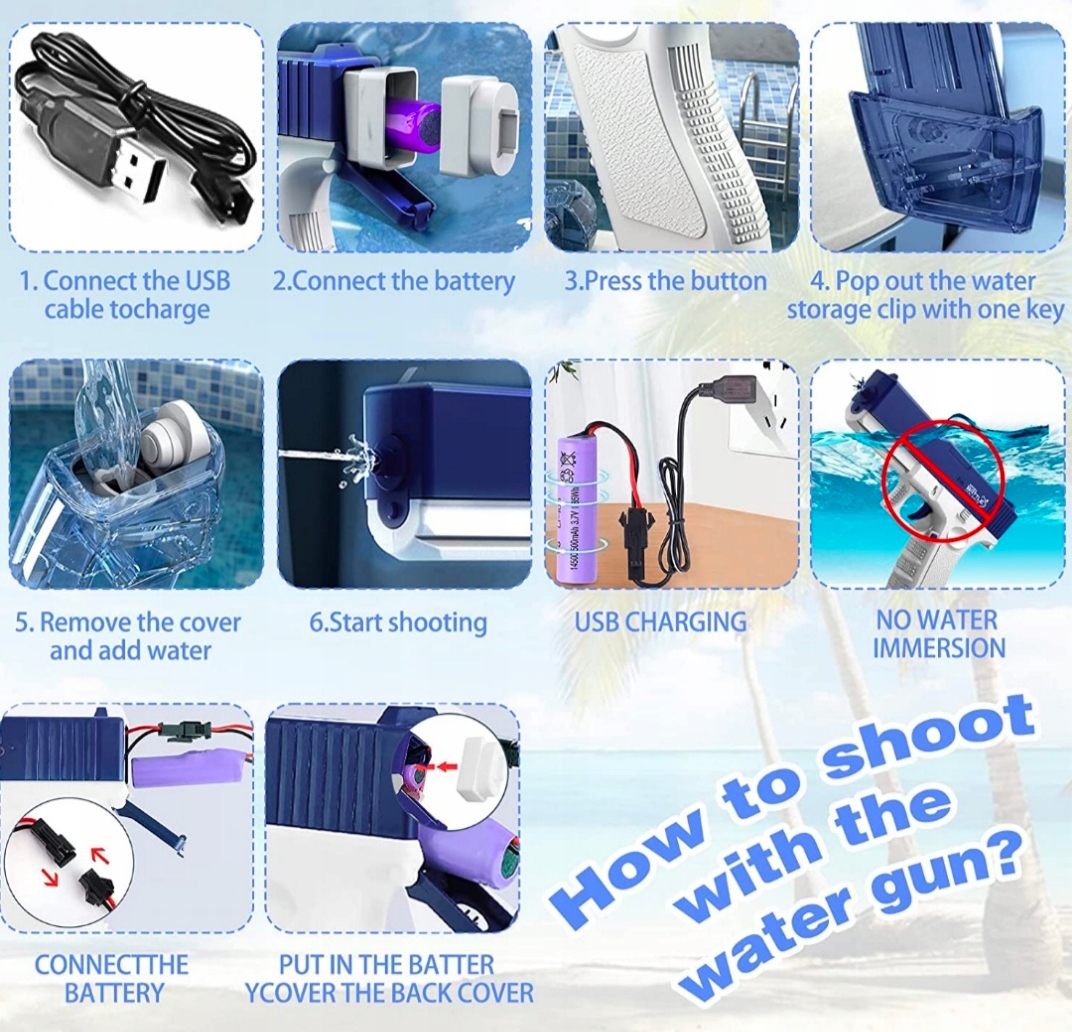 синій колір. (Примітка: Водяний пістолет розроблений з двома водонепроникними шарами, які можуть піддаватися воді протягом короткого періоду часу. Але, будь ласка, не занурюйтесь тривалий час! Щоб не завдати шкоди електронним компонентам.
