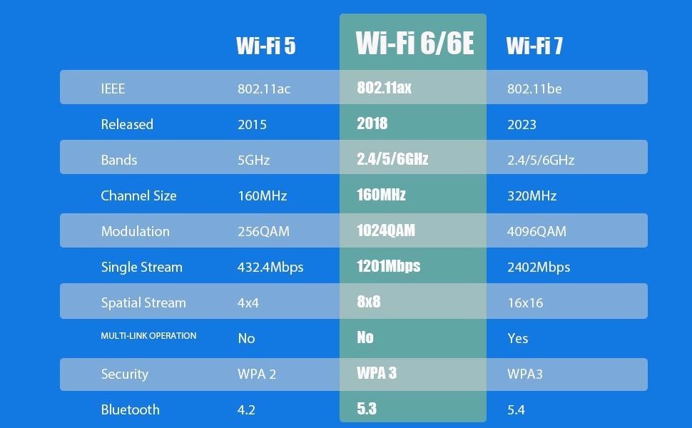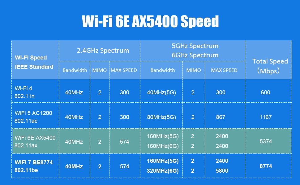 - Wi-Fi 6E може досягати максимальної швидкості 2,4 Гбіт/с на ПК-клієнті, що менше, ніж Wi-Fi 7 (5,8 Гбіт/с), але швидше, ніж Wi-Fi 5 (867 Мбіт/с).