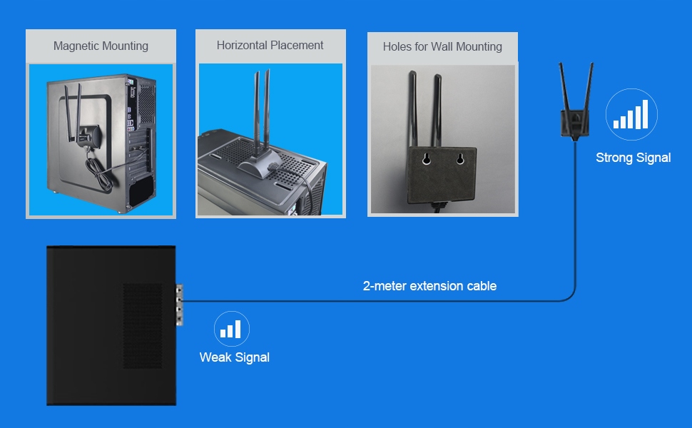 - Тридіапазонна всеспрямована антена 2x2 6 дБі: зменшіть мертві точки сигналу за допомогою 2-метрового подовжувача. Магнітну основу можна прикріпити до бічної панелі корпусу комп'ютера, не займаючи місця на столі. Ви можете вільно розмістити антену в оптимальному місці для прийому сигналу.