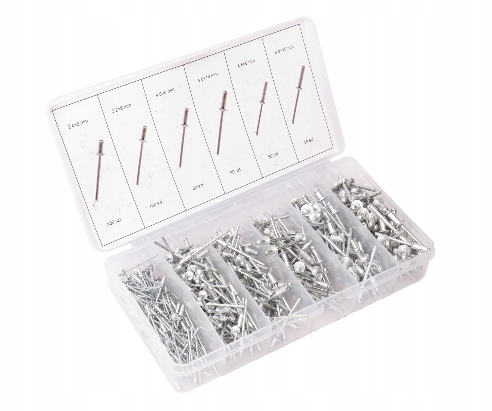 ✅Універсальний набір глухих заклепок для клепки. Все розміщено в зручній коробці з відділеннями, розділеними на розміри. Кожне відділення має свої розміри.