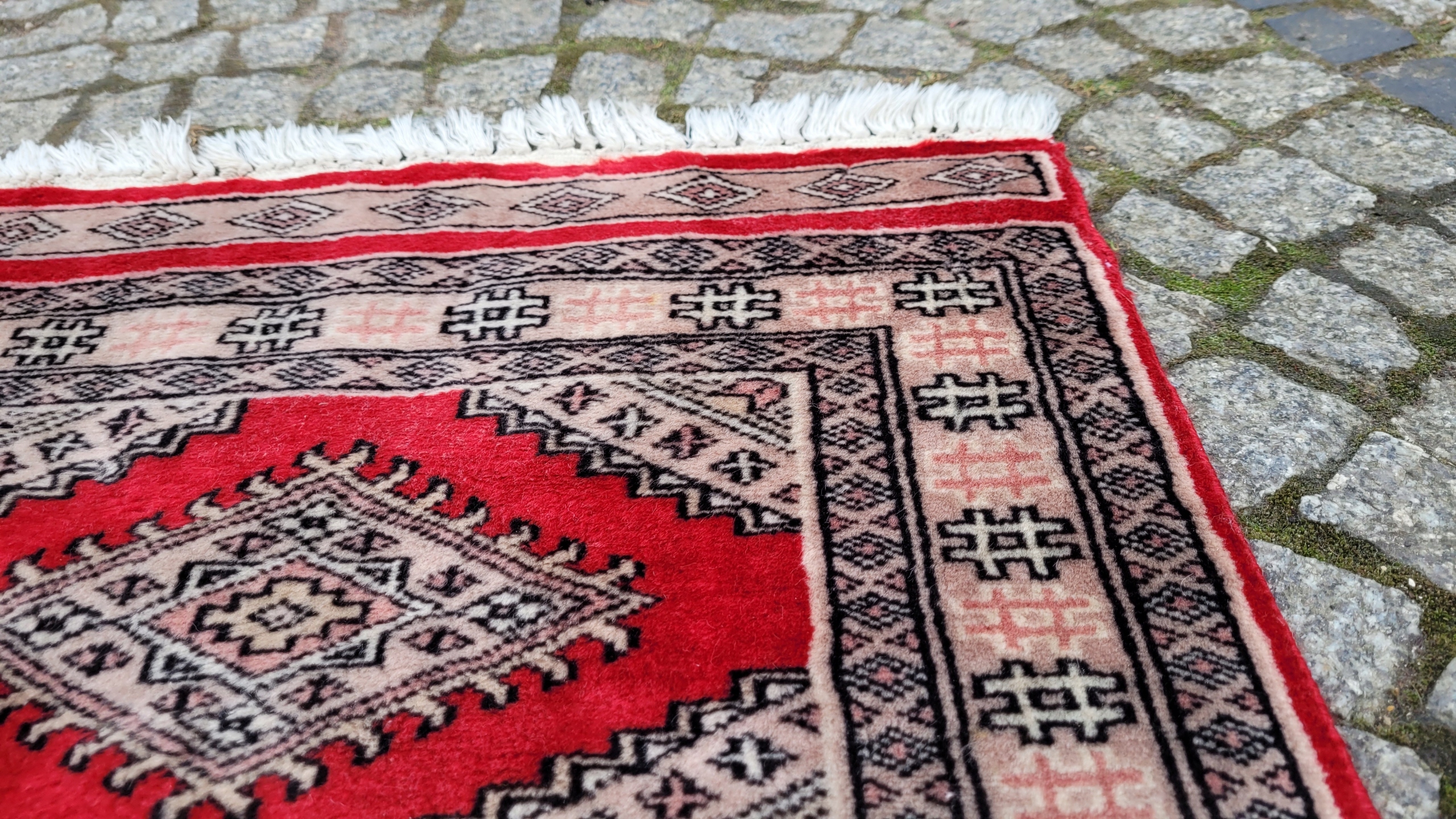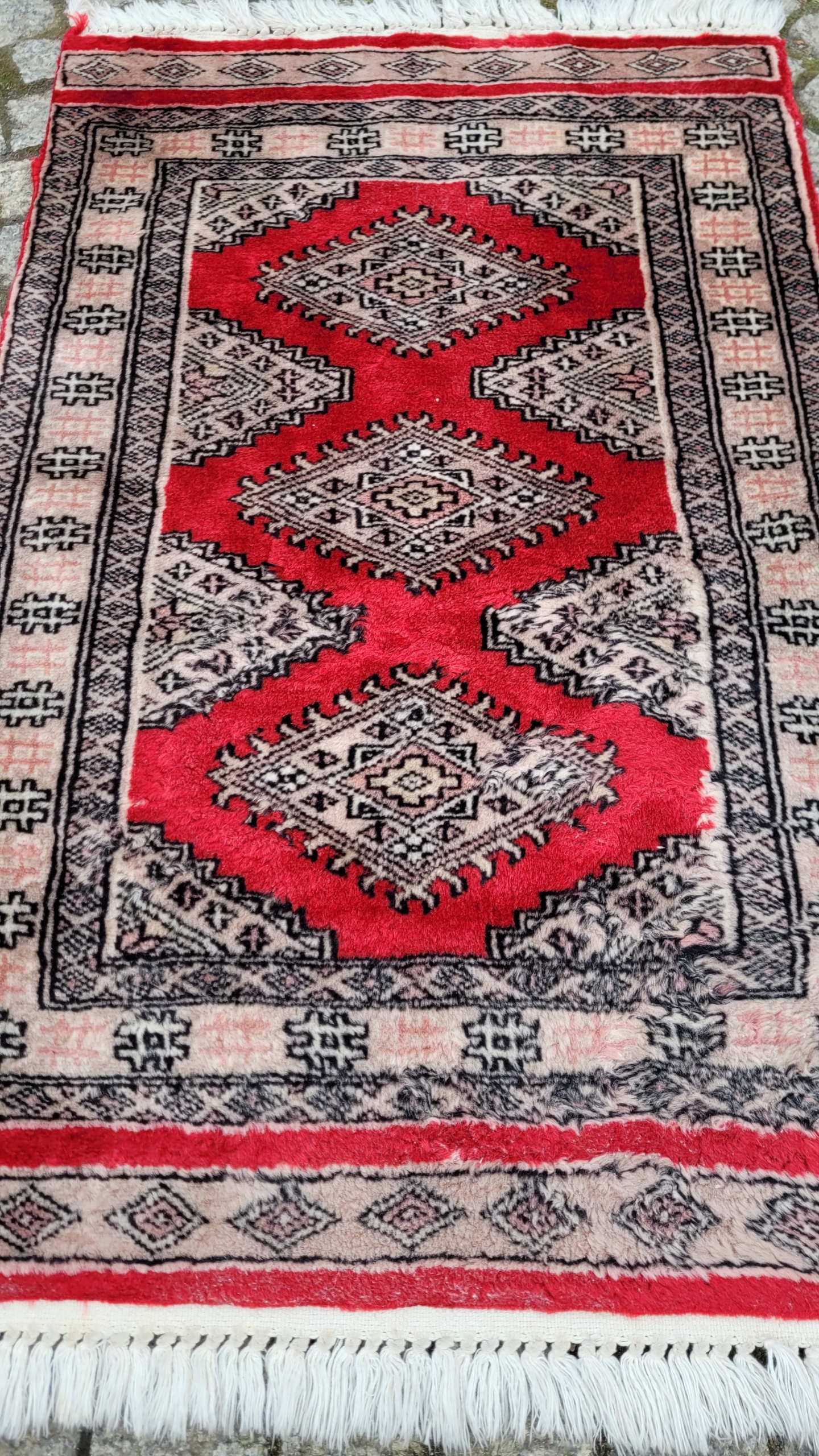 Бухарський килим. Виткана вручну з полірованої вовни найвищої якості. Характеризується компактним, приємним на дотик, блискучим флісом і красивими кольорами та візерунками. Він у дуже хорошому стані, мінус видно на фотографіях.