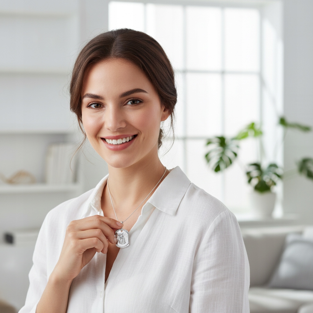 Медаль із зображенням Матері Божої Ченстоховської, Королеви Польщі, символ турботи, любові та постійної присутності в житті віруючих. Виготовлений зі срібла 925 проби найвищої якості з діамантовим покриттям, яке додає елегантності та блиску.