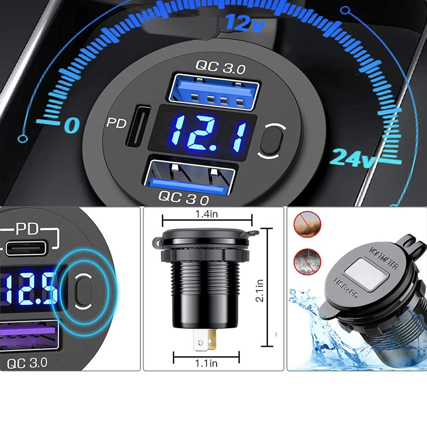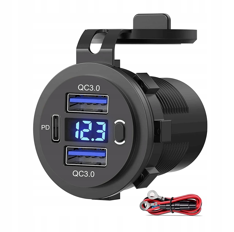 Gniazdo samochodowe USB 2 QC 3.0 PD ВОЛЬТМЕТР 12V 24V IP65 Вимикач 66W