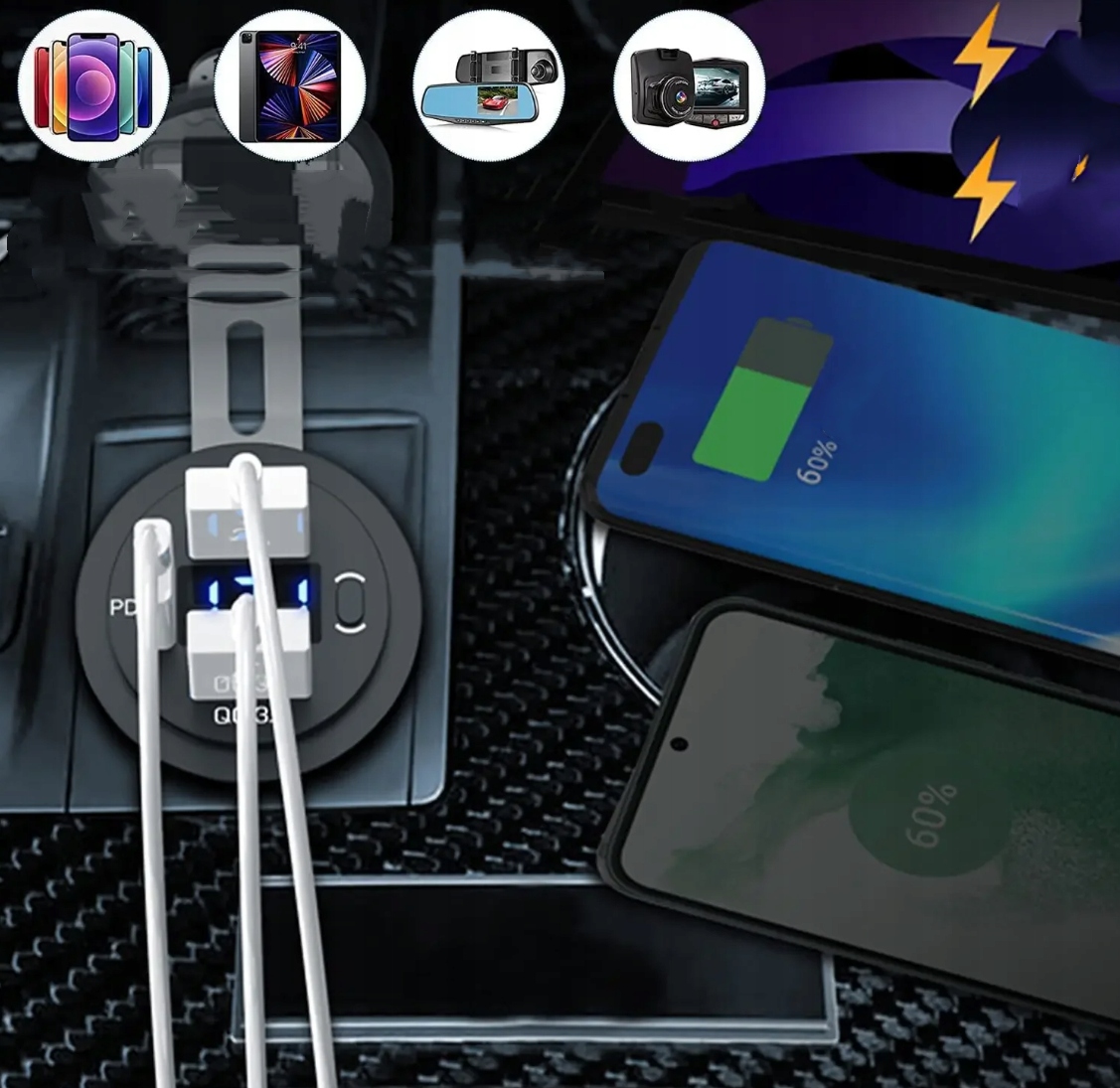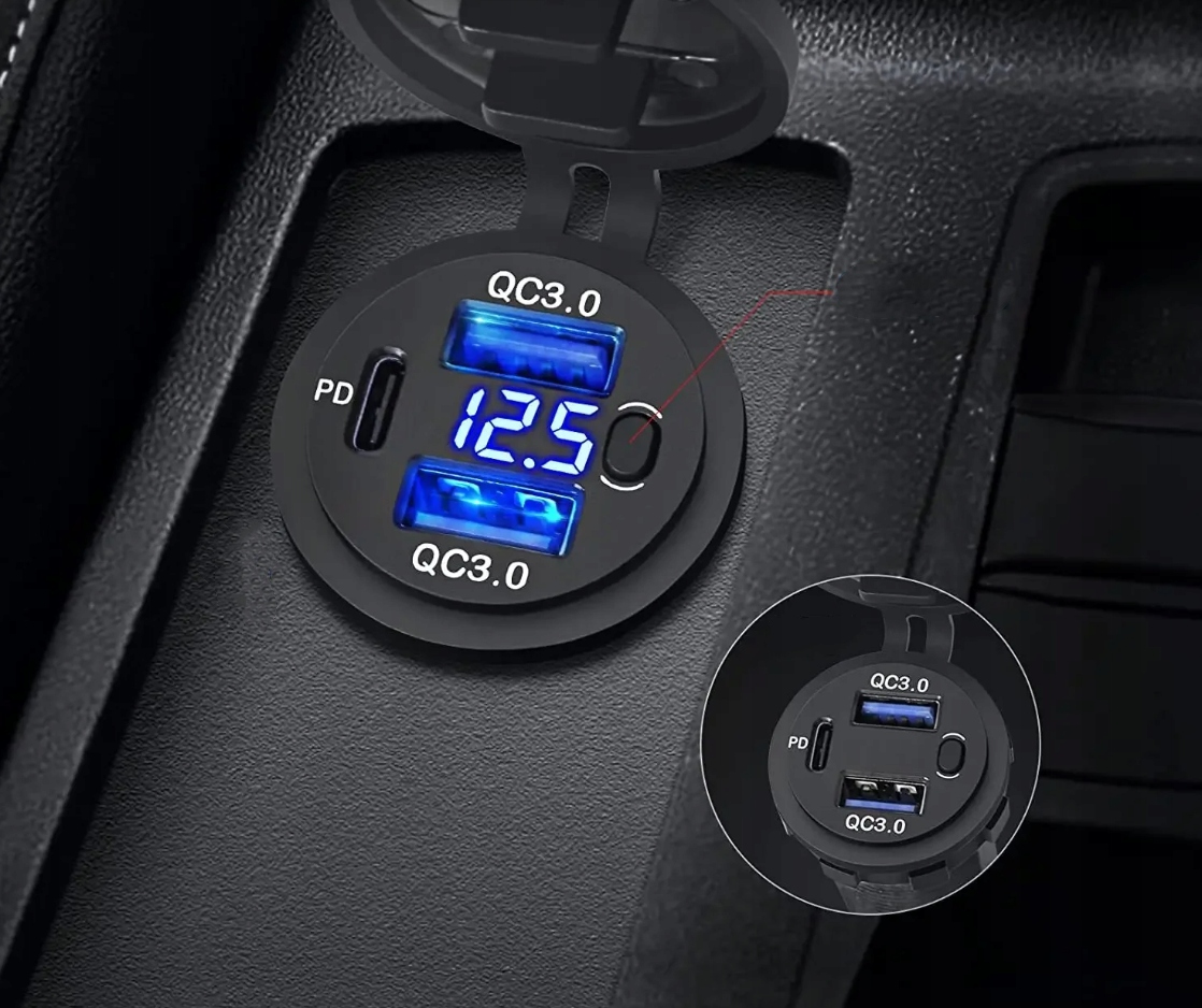 - USB-зарядний пристрій із трьома USB-портами (2 x USB QC 3.0 + PD) з перемикачем.