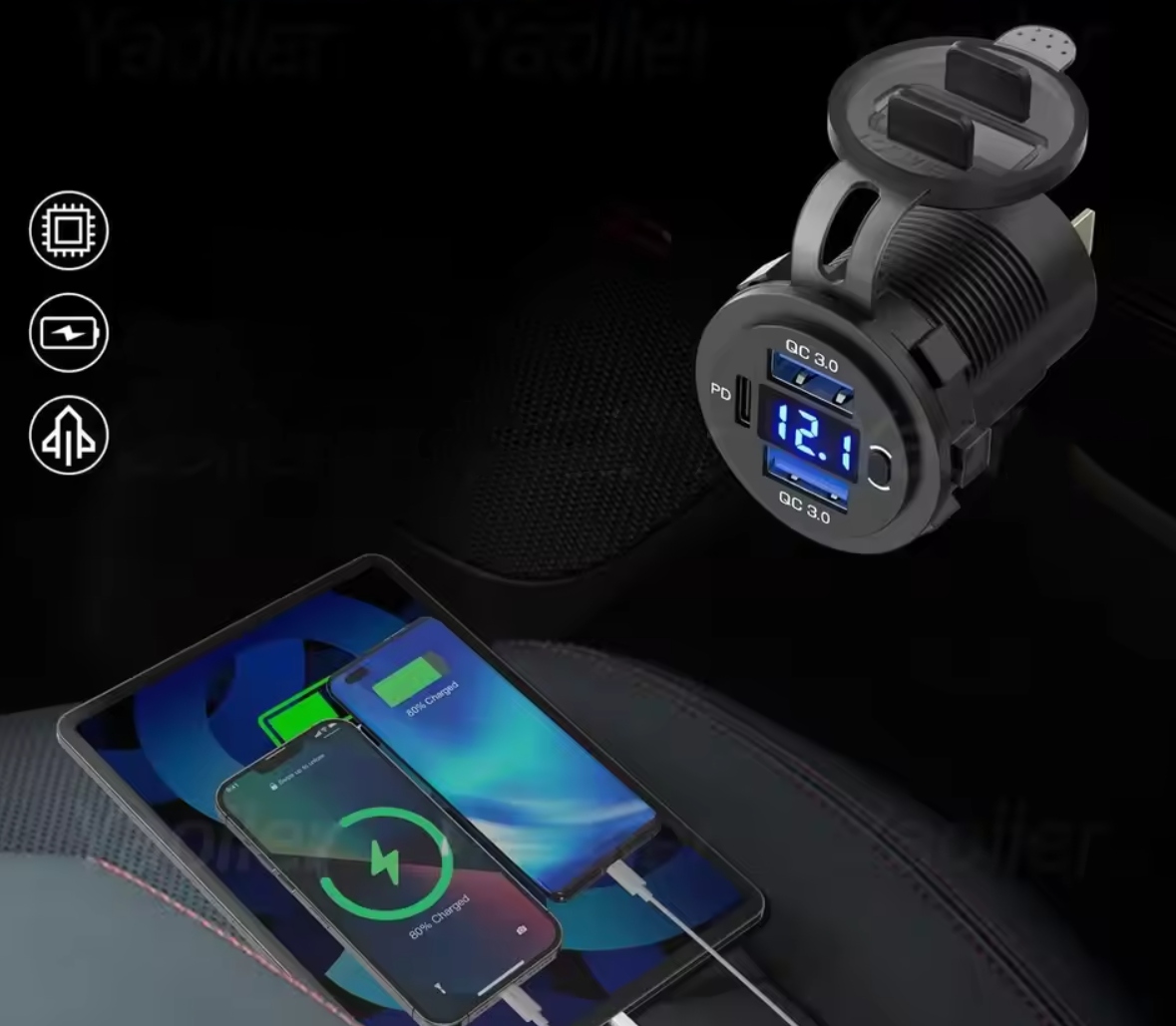 Ця автомобільна USB-розетка на 12 В має вдосконалену вбудовану мікросхему, яка дозволяє швидко заряджати пристрій через три USB-порти одночасно. Інтелектуально визначає ваш пристрій і забезпечує найшвидше та найефективніше живлення.