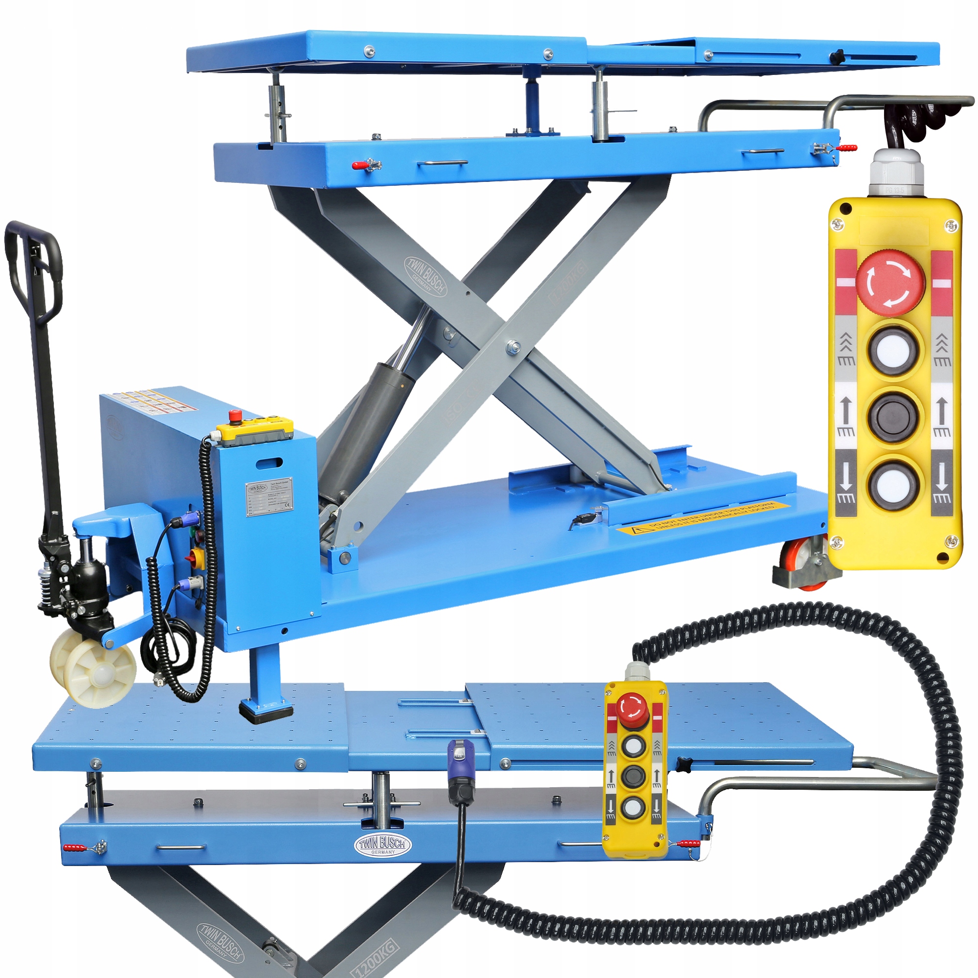 Підйомник-ножичний стіл 1200 кг, з електрогідравлічним приводом 230 В і подвійною швидкістю підйому, кабельним дистанційним керуванням, нахиленою платформою з подовженням, придатний для щоденного використання в професійній майстерні (8 адаптерних пластин і 8 датчиків доступні додатково). Підйомник можна переміщати так само легко, як візок для піддонів.