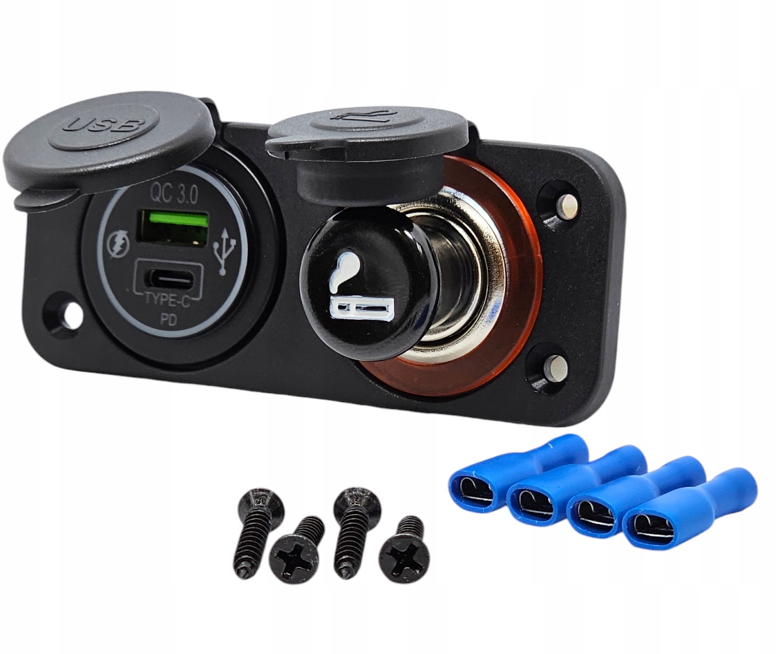 Універсальна зарядна панель, що складається з гнізда прикурювача на 12 В і подвійного USB-роз’єму (USB-A QC 3.0 + USB-C PD).