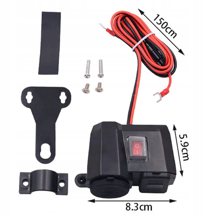Стандартна розетка прикурювача 12 В для використання на мотоциклі, ідеальна для підключення телефону, навігації тощо, Кількість USB-портів: 2 - 5 В/2,1 А, Довжина кабелю 130-150 см