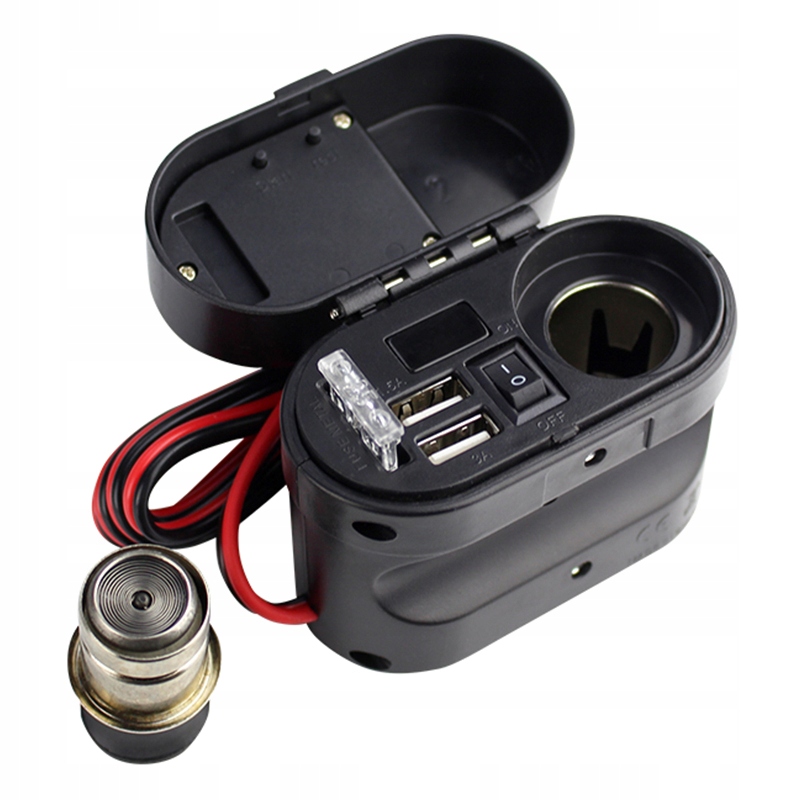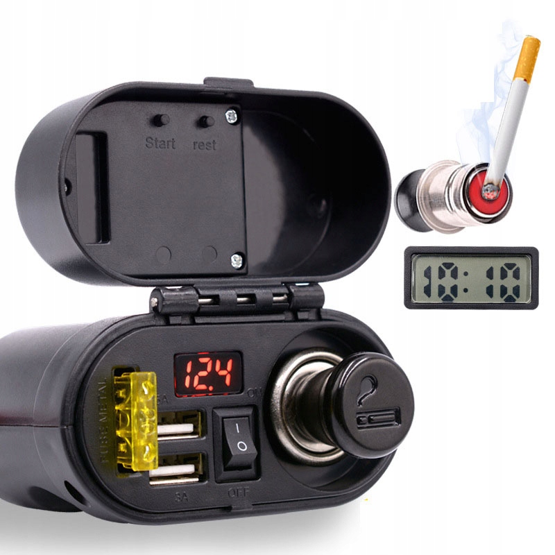 Водонепроникне гніздо прикурювача для мотоцикла, скутера, квадроцикла. Оснащений вольтметром, який показує напругу зарядки акумулятора. Крім того, два потужні USB-порти 5 В 3,1 А та годинник.