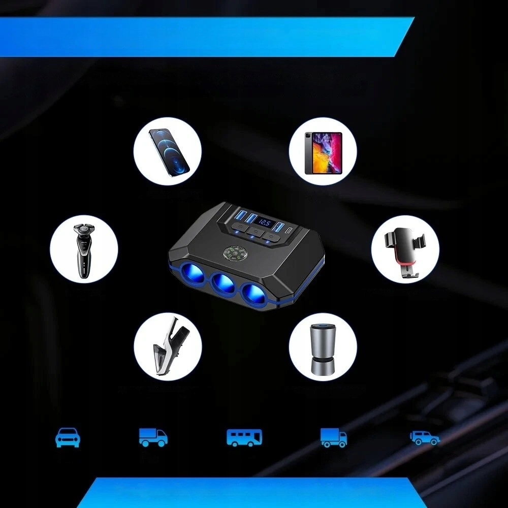 1. Адаптер для автомобільного прикурювача 7 в 1, зарядний пристрій для автомобільного прикурювача з 4 портами USB для зарядки та 3 гніздами для прикурювача загальною потужністю 120 Вт.