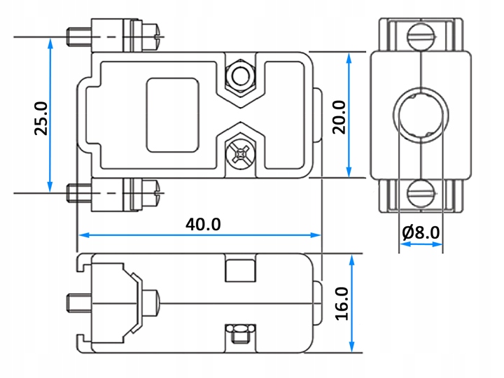 Пропоноване гніздо являє собою 9-контактний D-SUB гніздо. Найчастіше використовується в комп'ютерній техніці для послідовної передачі даних при зв'язку між пристроями. Кабель кріпиться до роз'єму за допомогою пайки. Пропонований набір складається з розетки і пластикової кришки, що закручується. У комплект входять гвинти для кріплення кришки, кабельного замка і кріплення розетки. Розміри роз’єму та кришки наведено нижче: