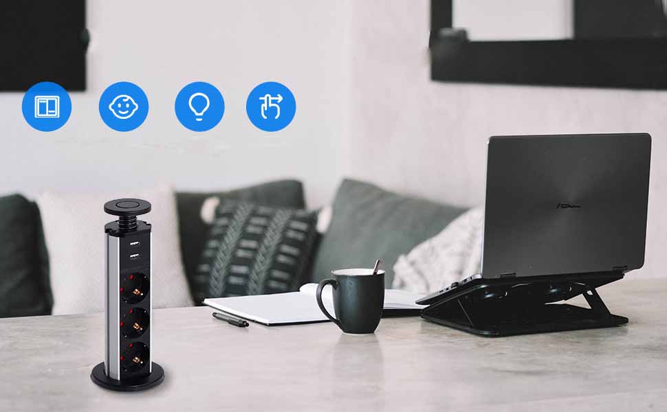 ✔ Є 3 електричні розетки та 2 порти USB A, які можна використовувати для зарядки/живлення мобільних телефонів, планшетів, пристроїв для приготування рису, соковикознавців та інших пристроїв.