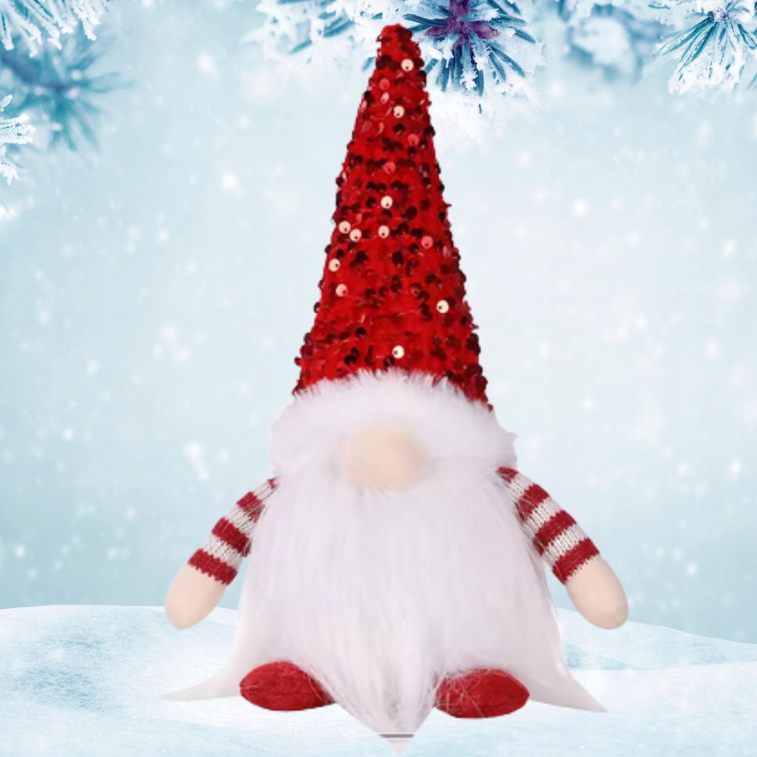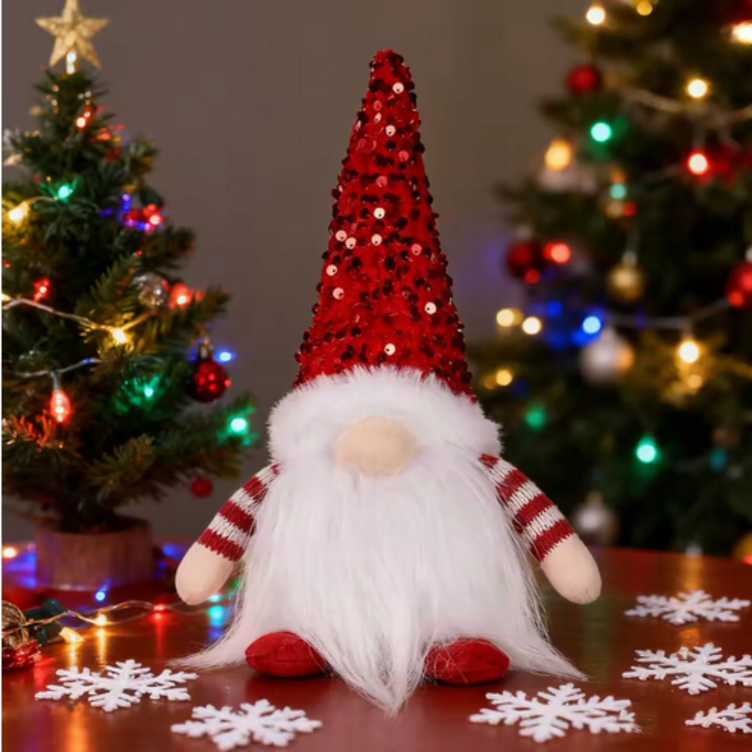 М’яка довга борода, плюшева обробка та кепка, прикрашена блискітками, привертають увагу та додають шарму будь-якому інтер’єру.