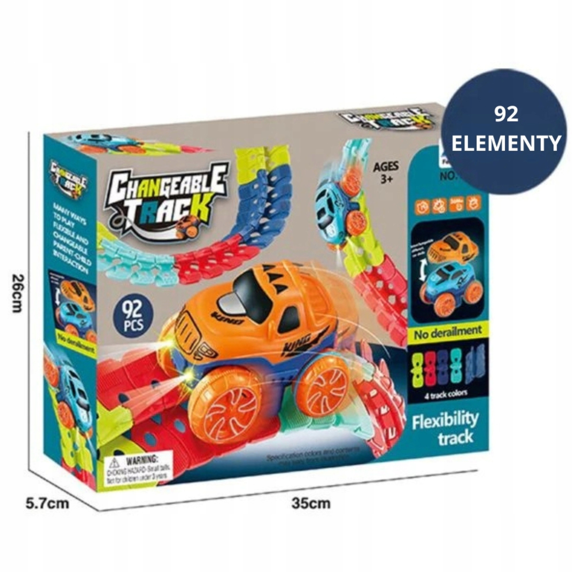 Траса складається з різнокольорових гнучких елементів, які можна вільно згинати, з’єднувати та компонувати в петлі. Діти можуть вести маршрут навіть крізь стільці, під меблями чи навколо предметів - єдиним обмеженням є їх уява!