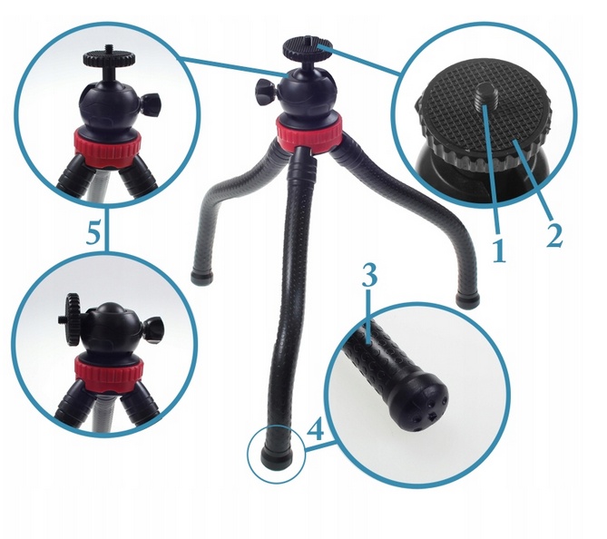 Його можна використовувати як настільний штатив, і кожну з ніжок можна вільно згинати, щоб ви могли поставити його на нерівну поверхню або прикріпити до гілки дерева чи садової сітки. На кінцях ніжок є гумові головки, що забезпечують стійкість на гладких поверхнях.