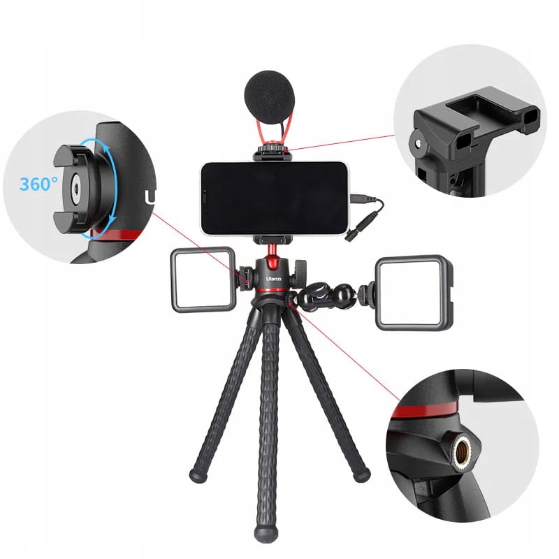 На штативі є кріплення 2x ISO, розташовані на голові та тримачі телефону, які дозволяють прикріпити до набору додаткові аксесуари, такі як: мікрофони, світлодіодні лампи або оглядовий монітор.