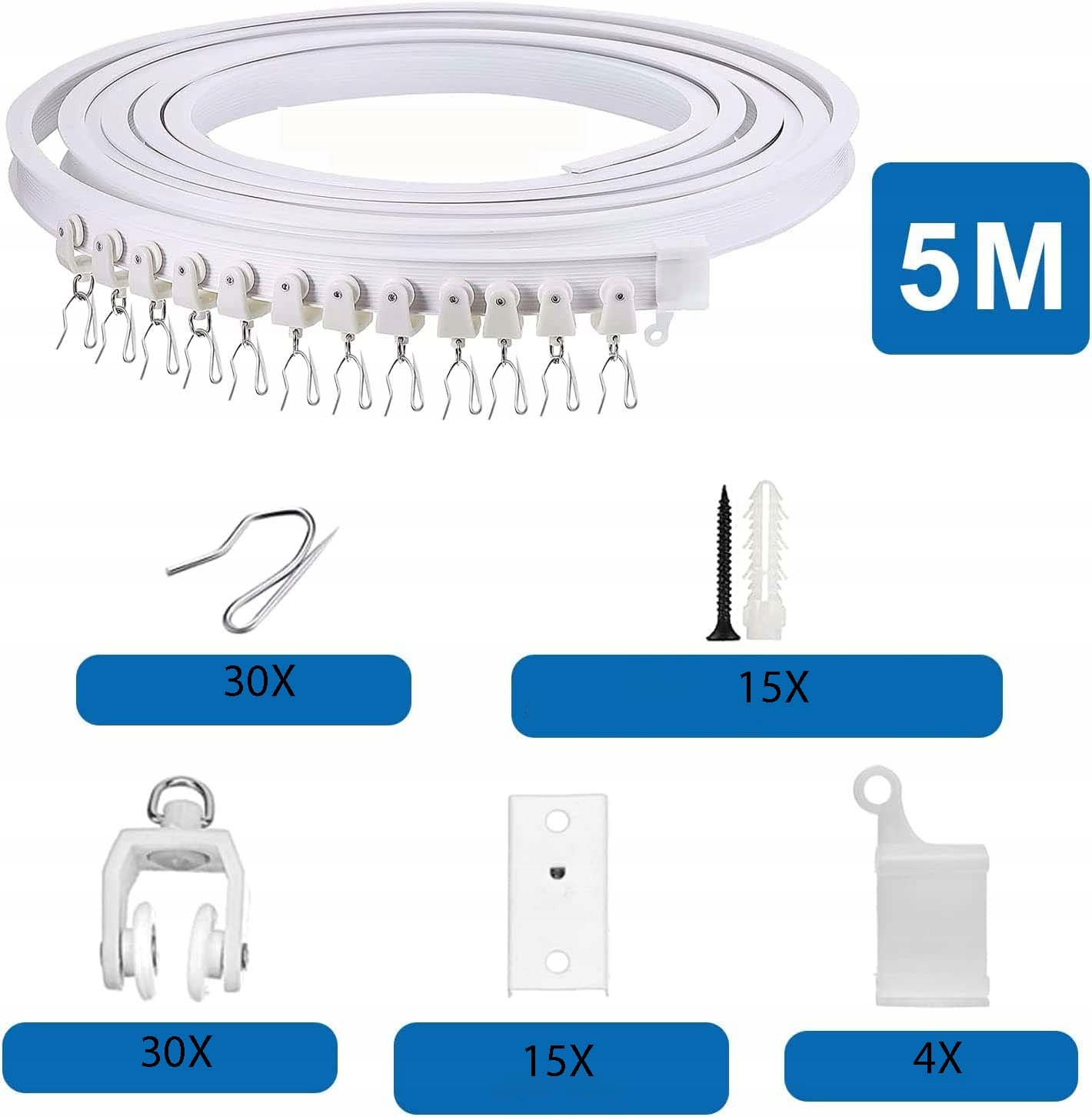 Ви отримаєте 1 5-метрову гнучку направляючу штору, 30 направляючих роликів, 30 гачків для штор, 15 знімних кронштейнів для стелі, 15 монтажних гвинтів, 4 торцеві кришки, велика кількість підходить для всього процесу встановлення шторна система