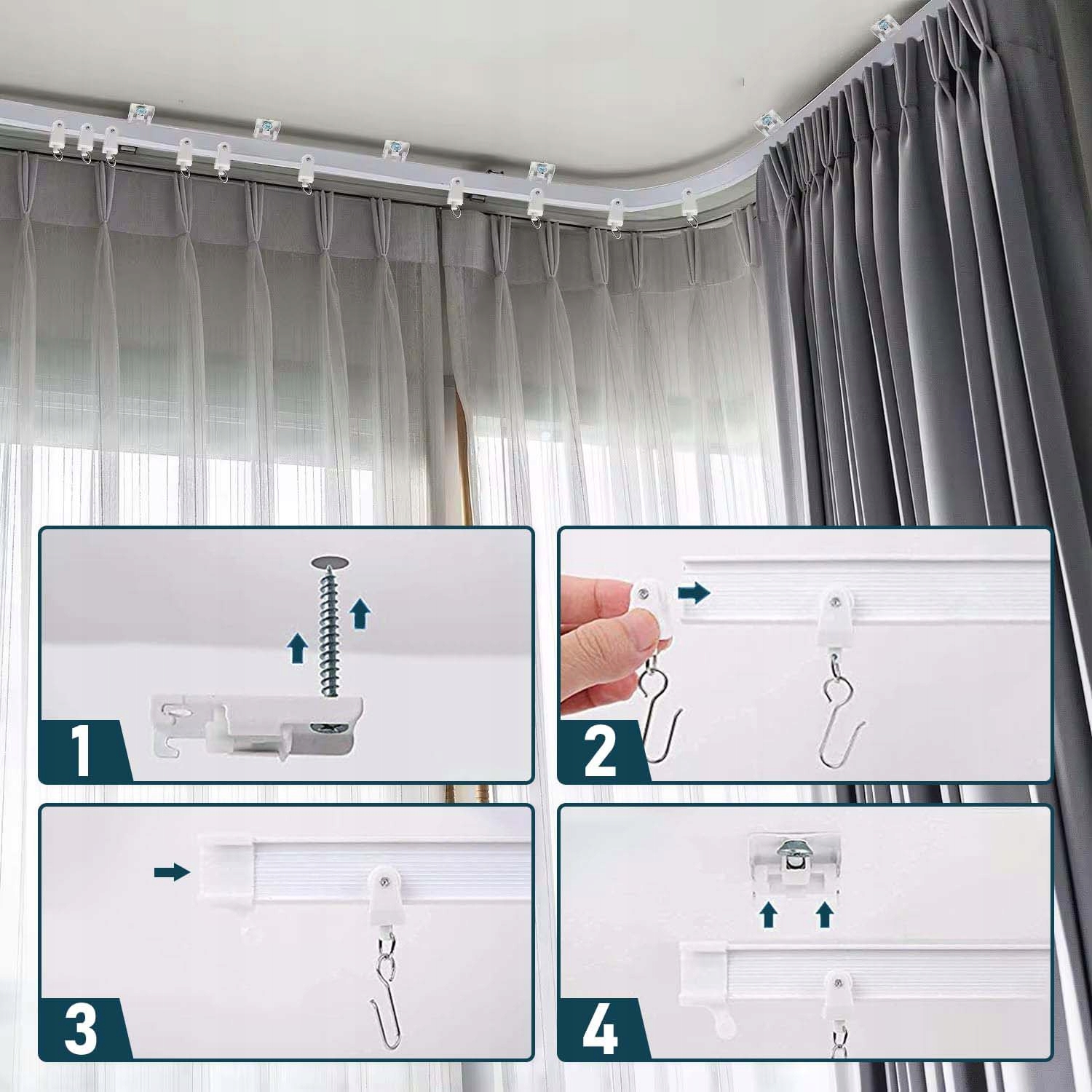 Аксесуари для коліщаток і знімні стельові кронштейни розроблені, щоб допомогти вам плавно та легко встановити рейки для штор, їх легко виконати, кроки встановлення можна завантажити з фотографії продукту