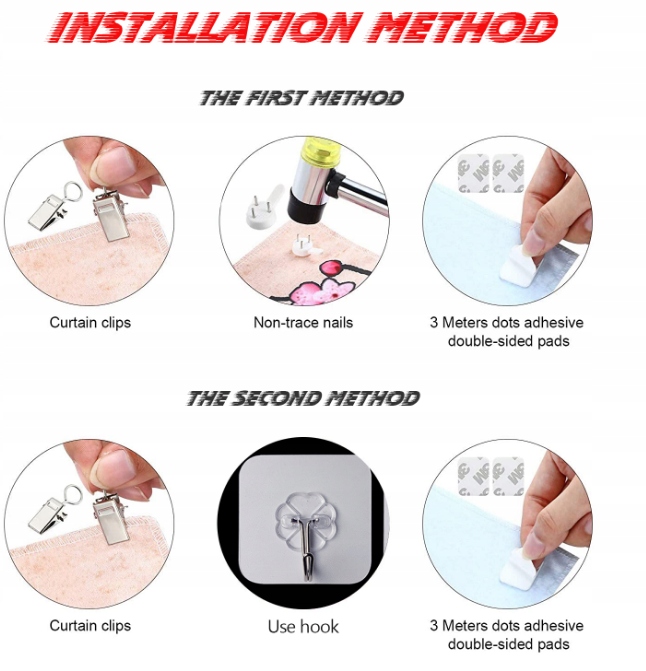 【Конструкція аксесуарів】 оснащена 3 колючими затискачами та 3 невигідними гачками для нігтів, на стіні можна прикріпити два кінці настінної ковдри, а це означає, що установка зручна і не пошкоджує стіну.