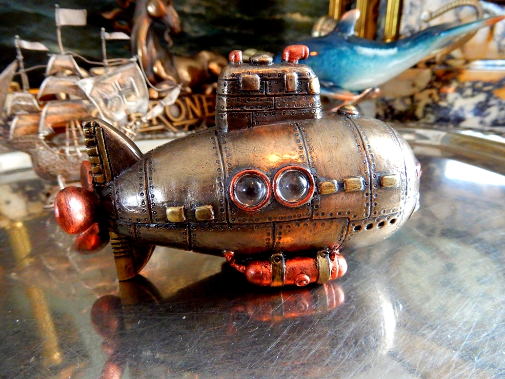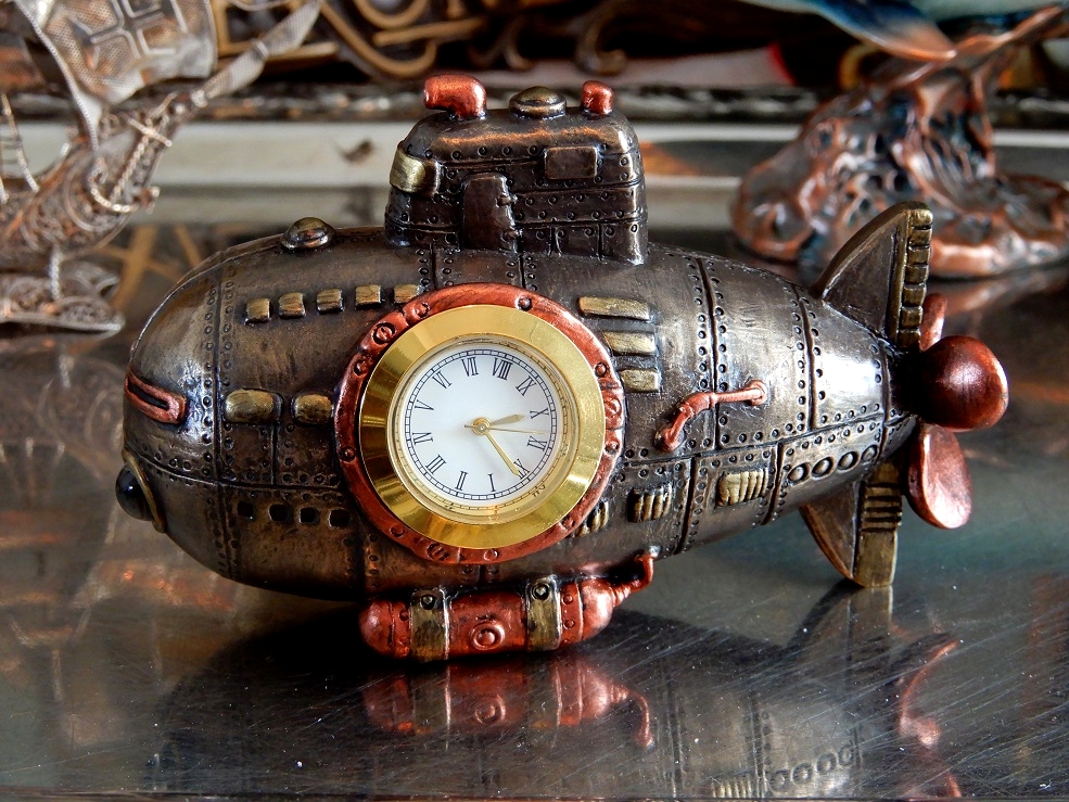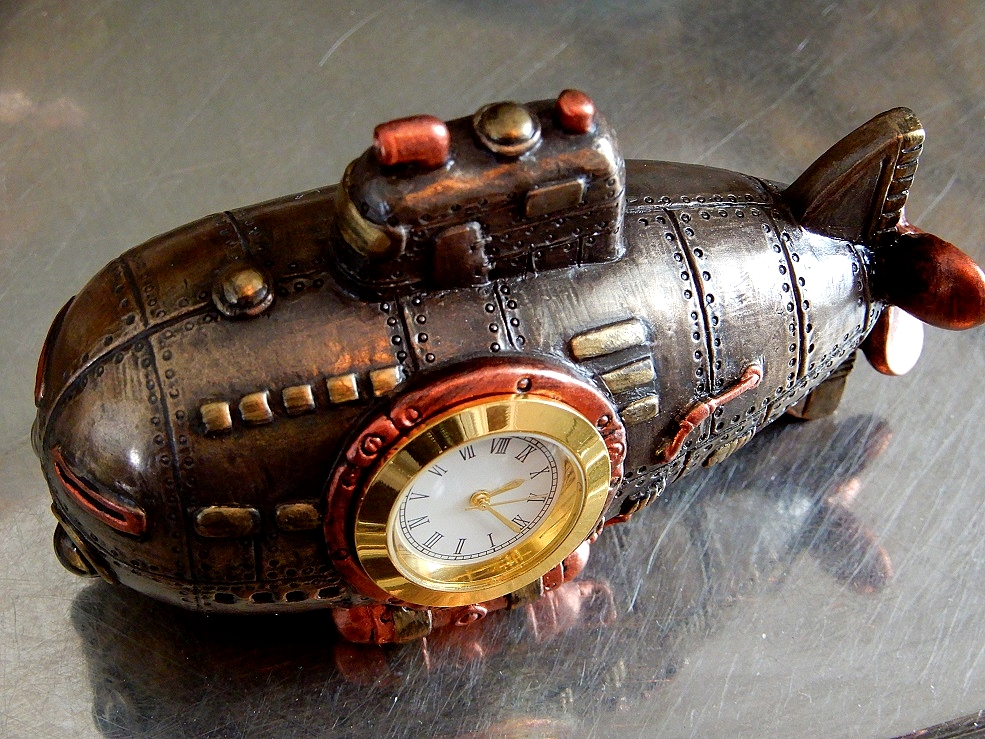 Запрошую придбати чудовий годинник, підводний човен, стиль, що відсилає до епохи вугілля та пари, гравюри за книгами Жуля Верна, фантастика 19 століття Колекція "Steampuk" На природі річ виглядає набагато краще .Бренд Veronese гарантує якість та зовнішній вигляд.Все це зроблено з матеріалу полірезин, покритий латунню, розписаний вручну.