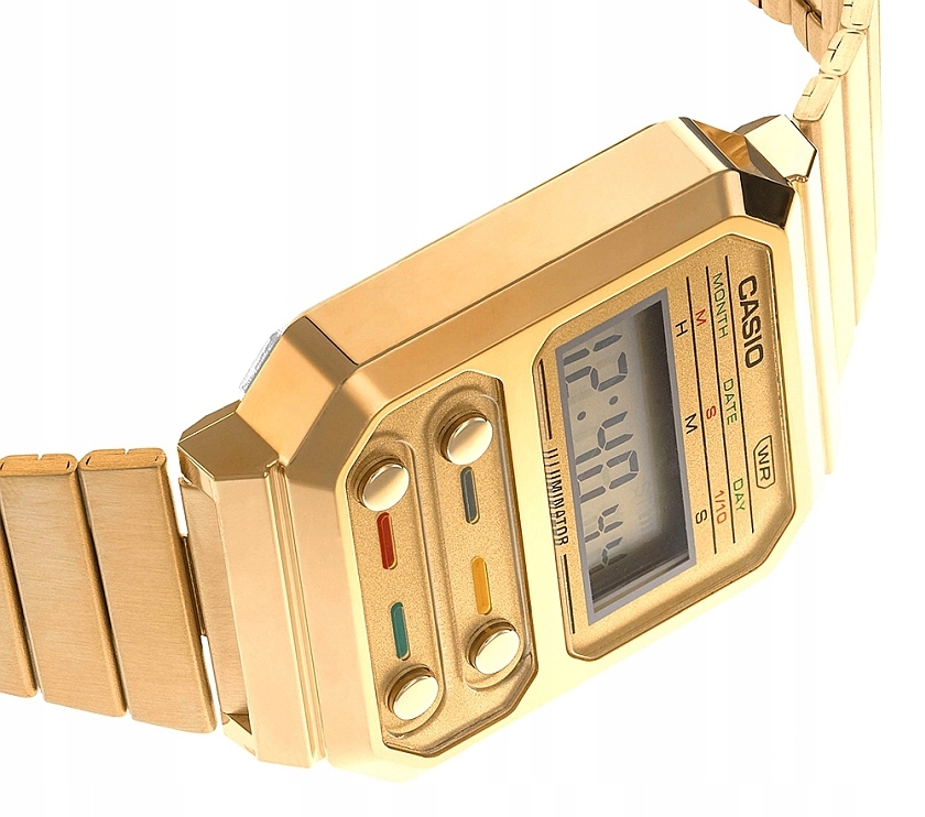 Новий стиль циферблата, що стосується телевізійних ігор кінця 1980-х. Добротний електронний годинник від японського виробника на сталевому браслеті, оксидованому в колір золота. Модель упакована в оригінальну коробку CASIO VINTAGE з гарантійним талоном та інструкцією польською мовою. Новий та оригінальний продукт.