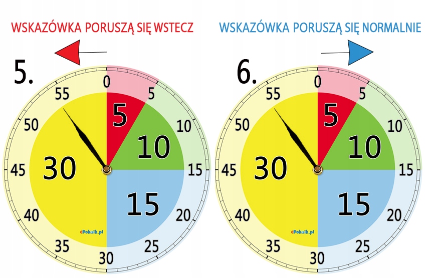 Годинник має одну стрілку, яка вимірює час назад - стрілка рухається назад. Це дозволяє дітям зрозуміти тривалість часу. Його призначення — проілюструвати 5-, 10-, 15-, 30-хвилинний інтервал часу за допомогою спеціального циферблата. Під час роботи ми відзначаємо час виконання завдання кольором, вручну встановлюючи вказівник у кінці відповідного кольору.