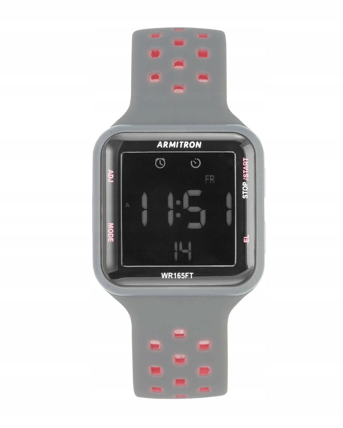 Спортивний годинник Armitron унісекс витонченої форми з сірим ремінцем і чорним квадратним багатофункціональним дисплеєм.