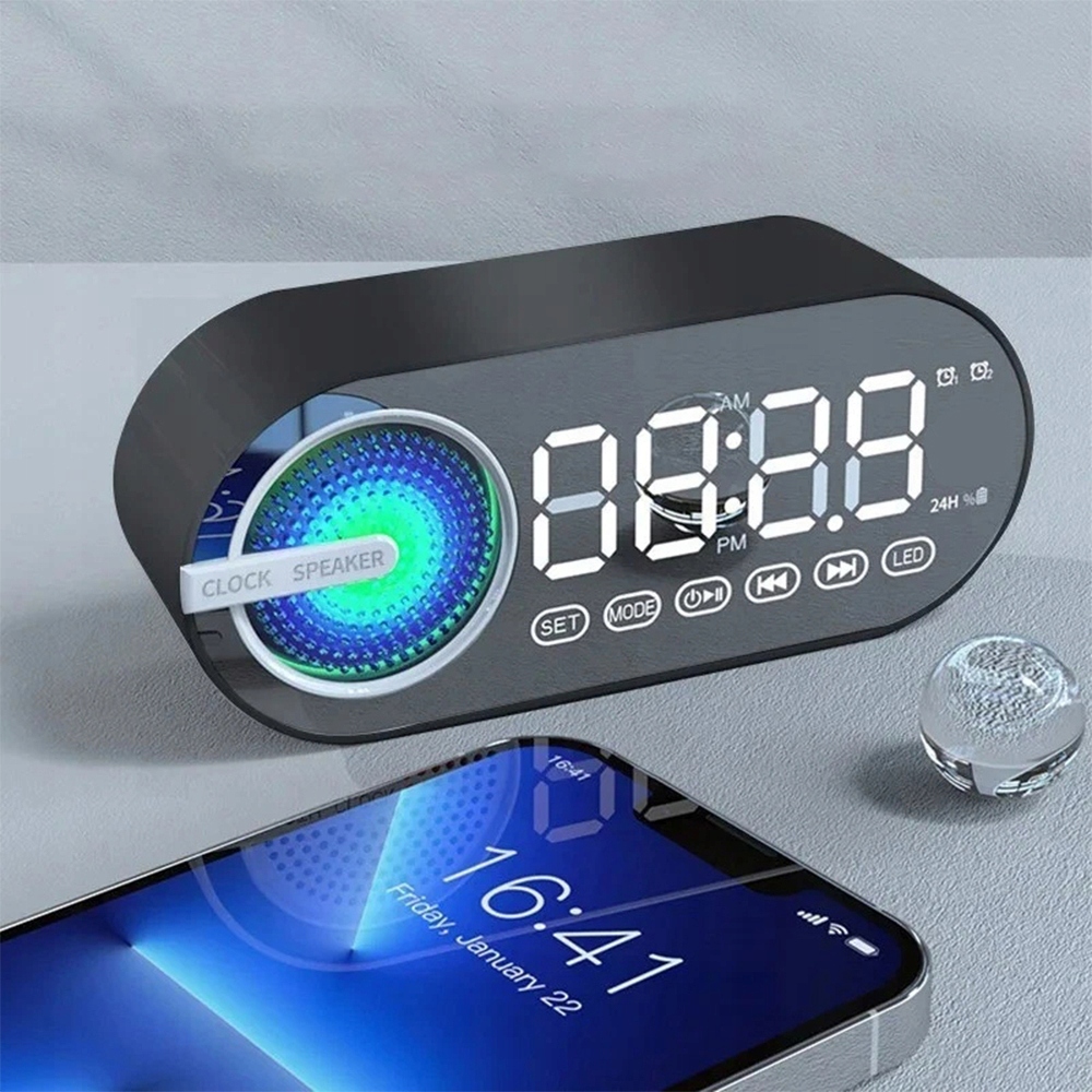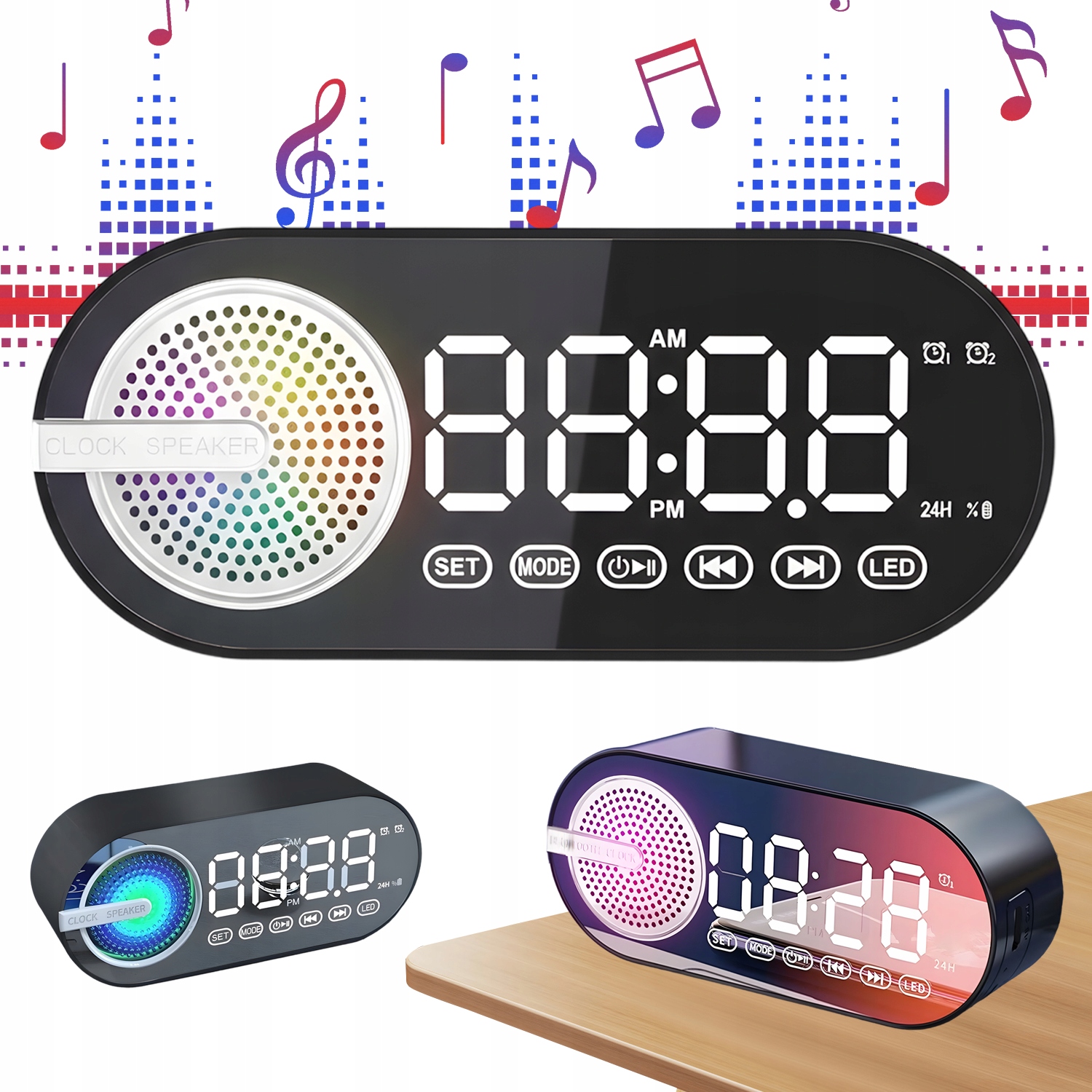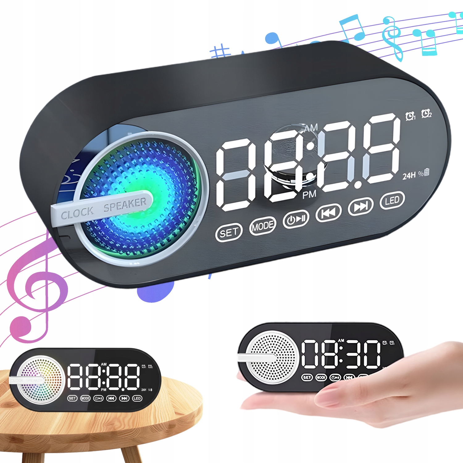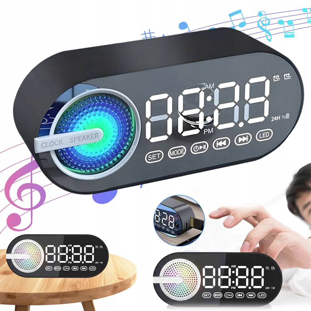 Bluetooth годинник, RGB LED колонка, FM радіо, подарунок чоловікові, сучасний годинник, польська доставка, гаджет 2025, LED будильник, дорожня колонка, RGB освітлення, бездротова технологія.