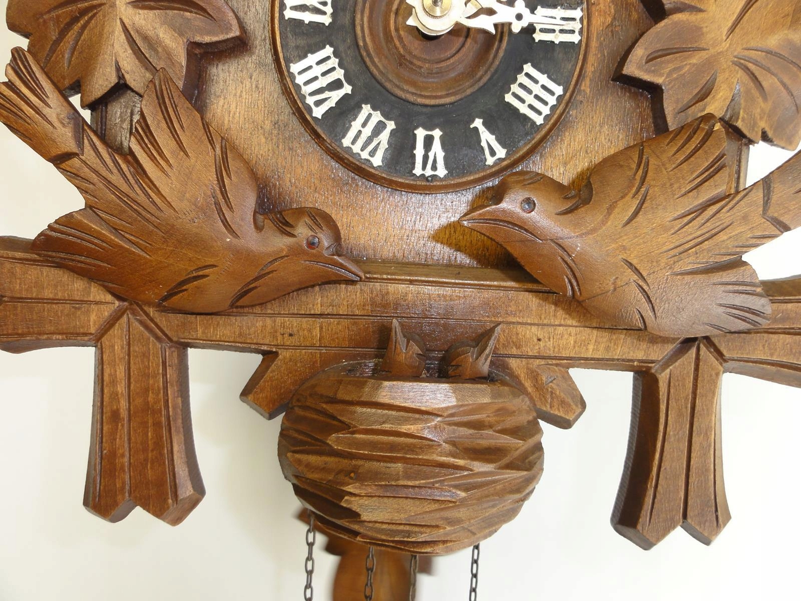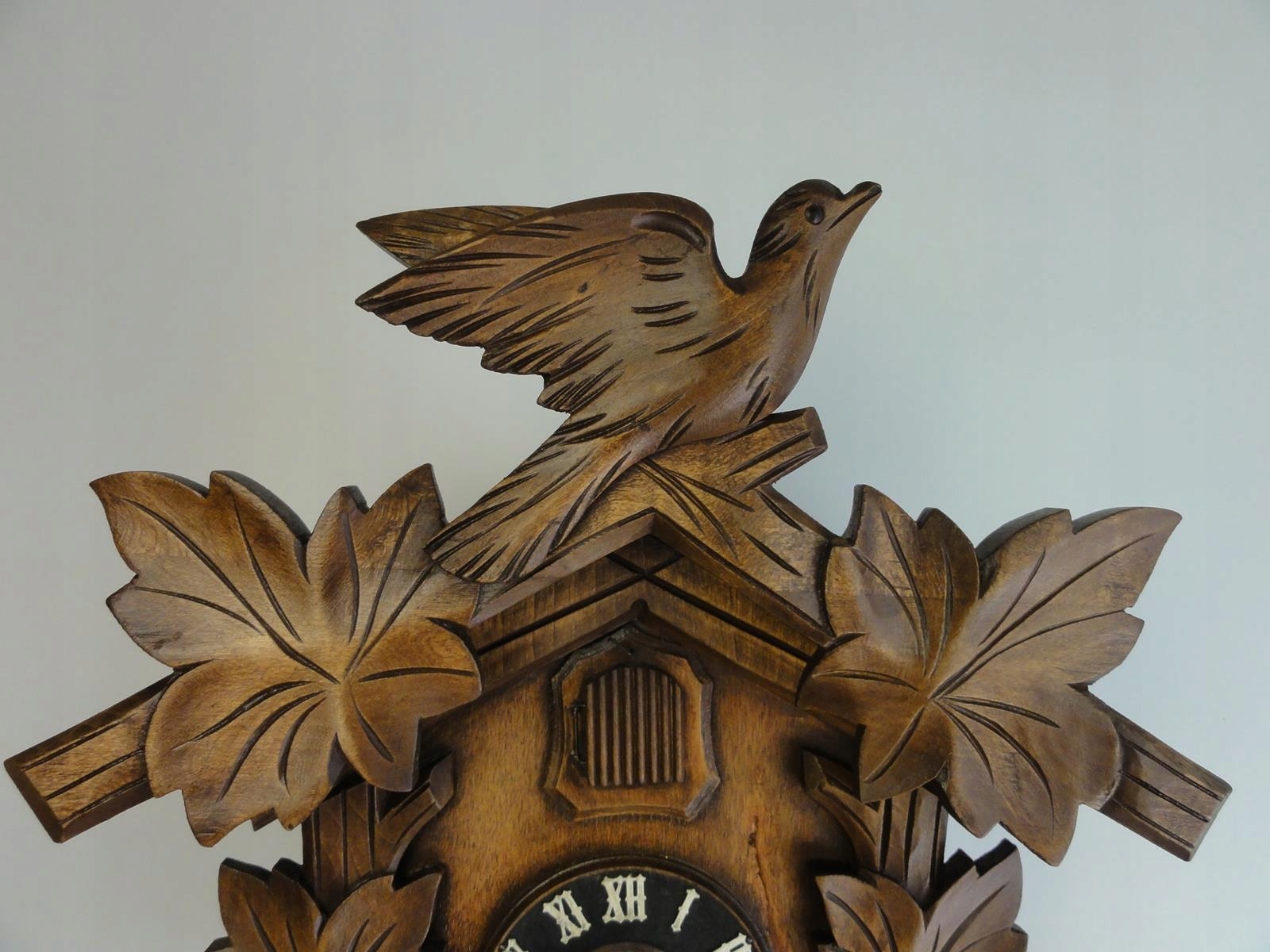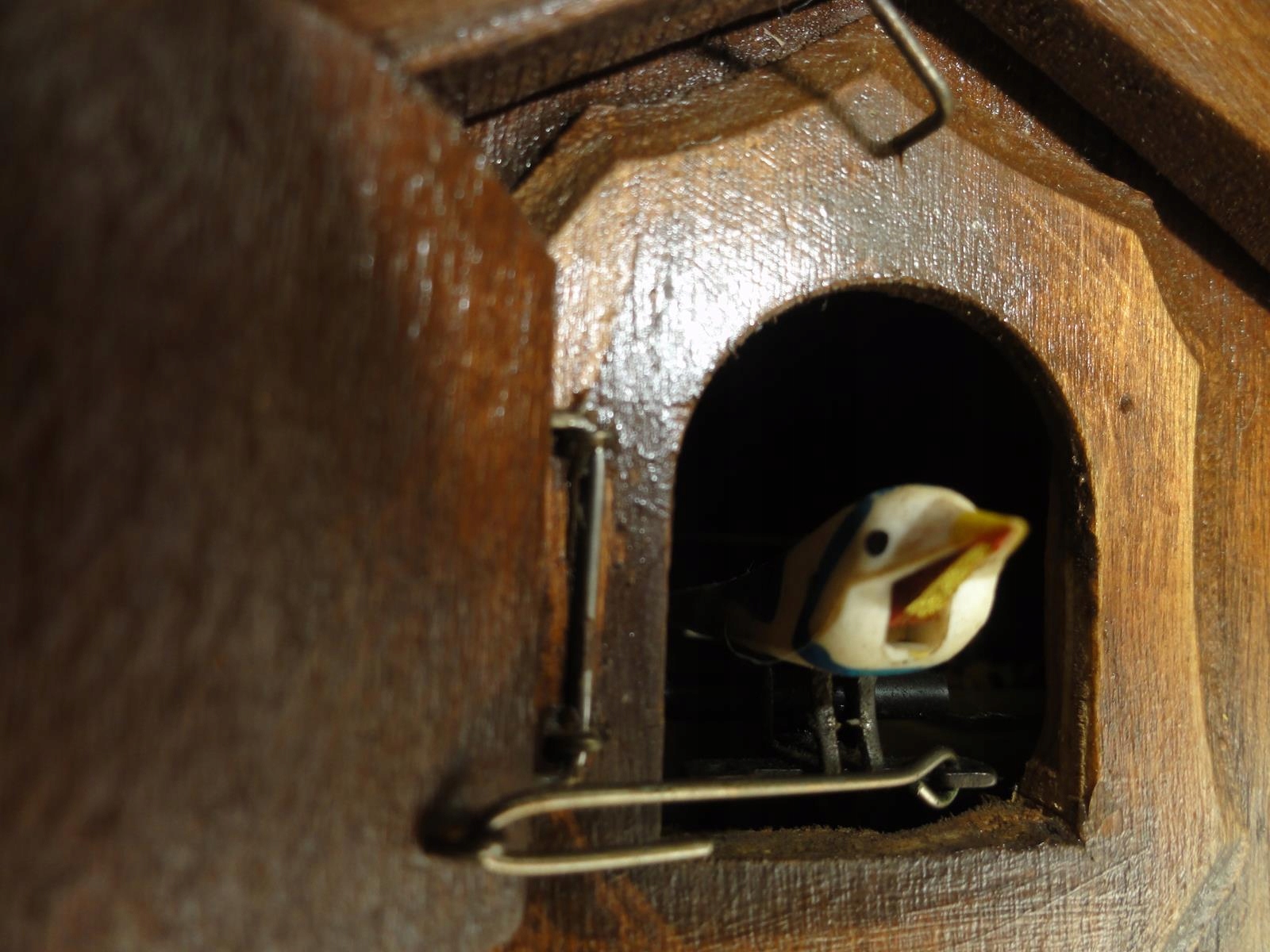 *годинник іде точно, повна та півгодини оголошує зозулю та побиття гонга, під час руху двох птахів на передній частині годин (вони годують пташенят, що сидять nest),