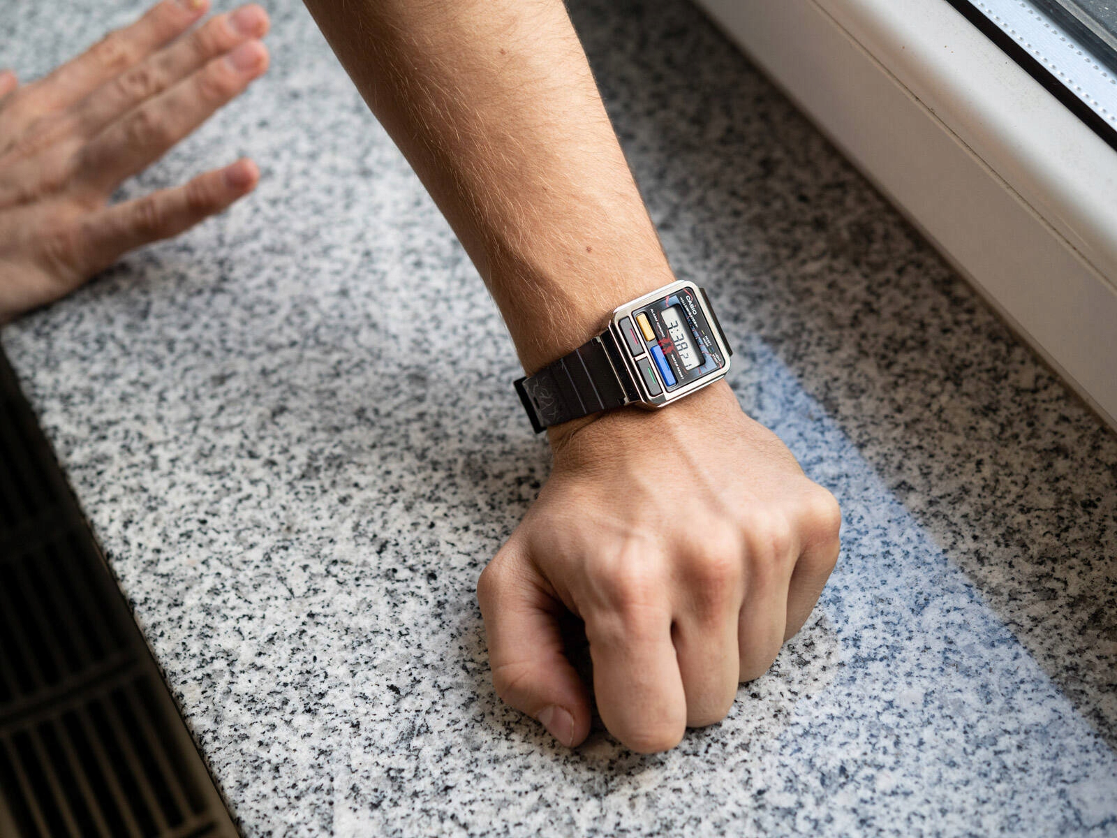 Годинник оснащено секундоміром, який вимірює час із точністю до 1/100 секунди.