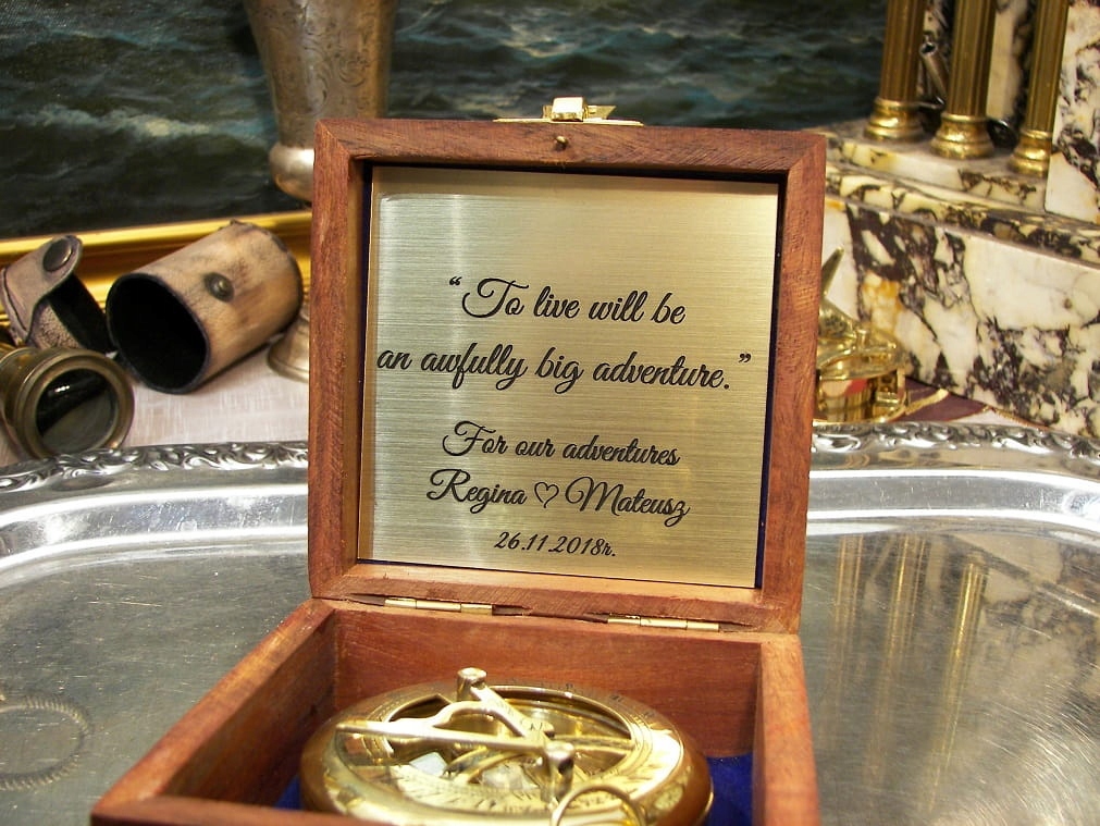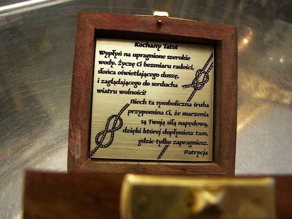 Ми виконуємо лазерне гравіювання на ламінованій дошці та вклеюємо її всередину кришці або на кришці коробки, безпосередньо на дереві