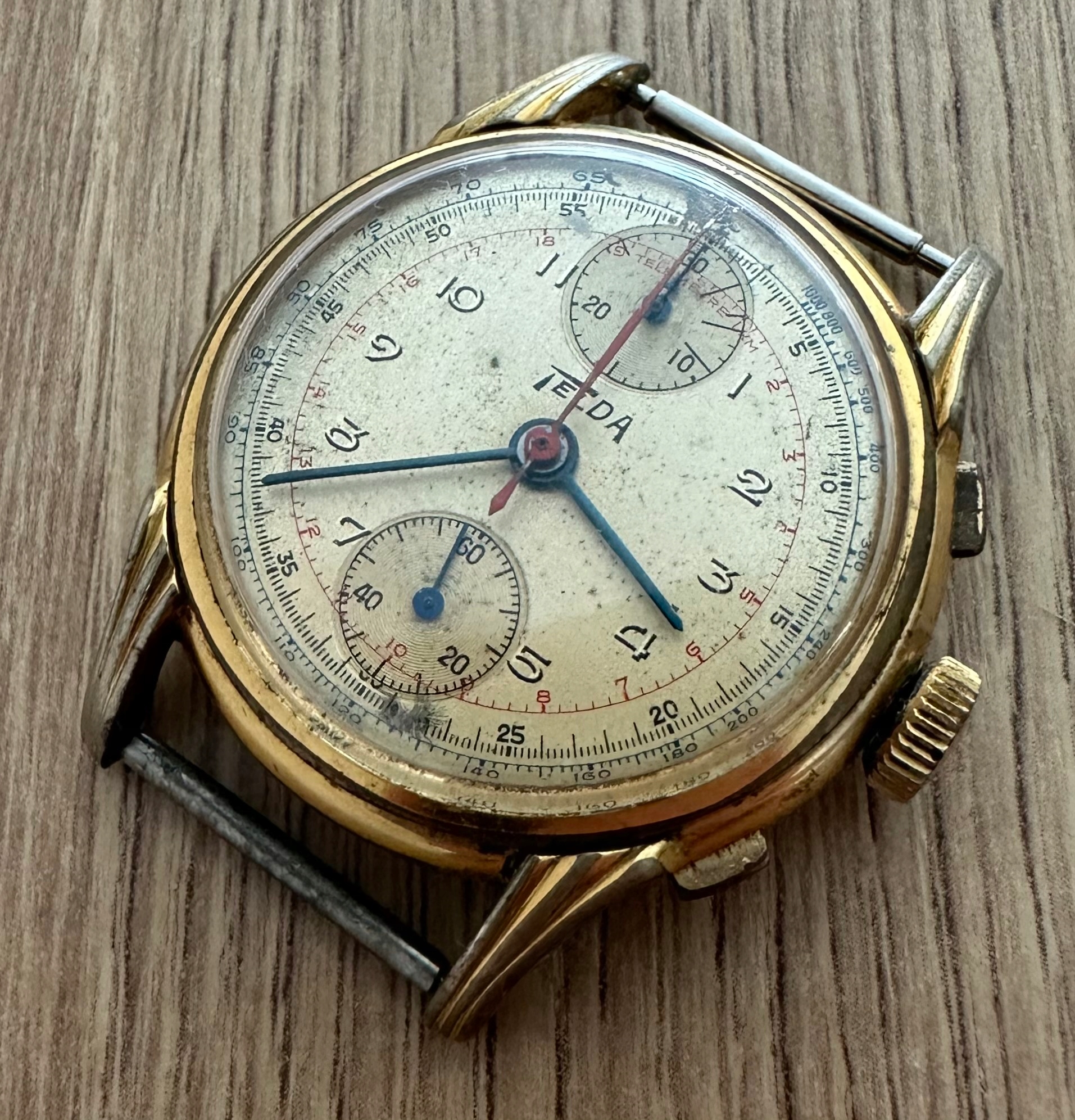 Продам позолочений годинник хронограф зі слідами використання від унікальної швейцарської компанії TELDA, в гарному оригінальному стані, на запчастини або ремонт.