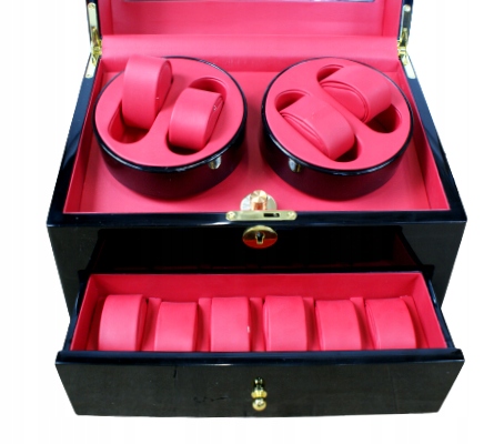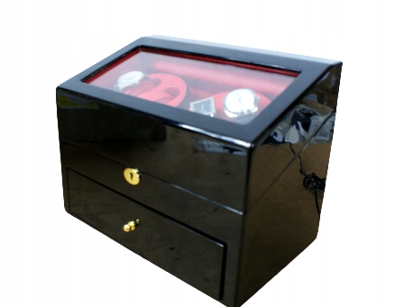 Репрезентативний ротомат із замком і великою вітриною для 10 годинників. Гарні матеріали та ретельна обробка. Елегантне поєднання чорного рояльного лаку, карміново-червоного інтер’єру та елементів золотого кольору.