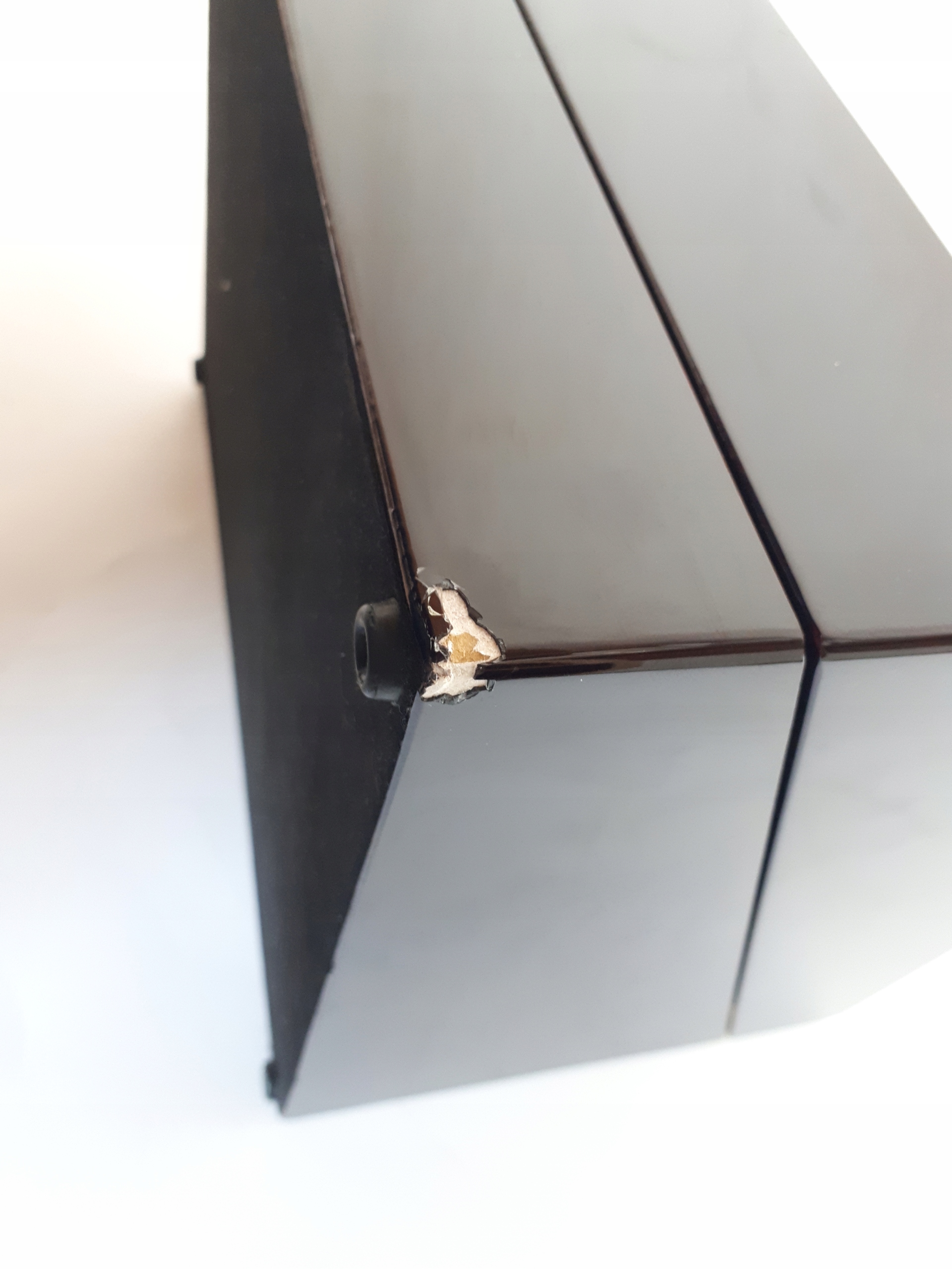 - Декоративний дизайн із бордово-червоний рояльний лак, відшліфований до високого глянцю, з деревним малюнком і великою вітриною