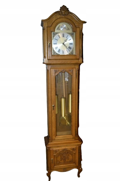 гарний підлоговий годинник на чверть години. Скриня виготовлена з дуба, оброблена в приємному відтінку. Скриня зі смаком оздоблена і має декоративну фурнітуру. Чвертьгодинний механізм відбиває години, половини та чверті. механізм справний. годинник має 8-струнний гонг. б/в, стан дуже гарний.