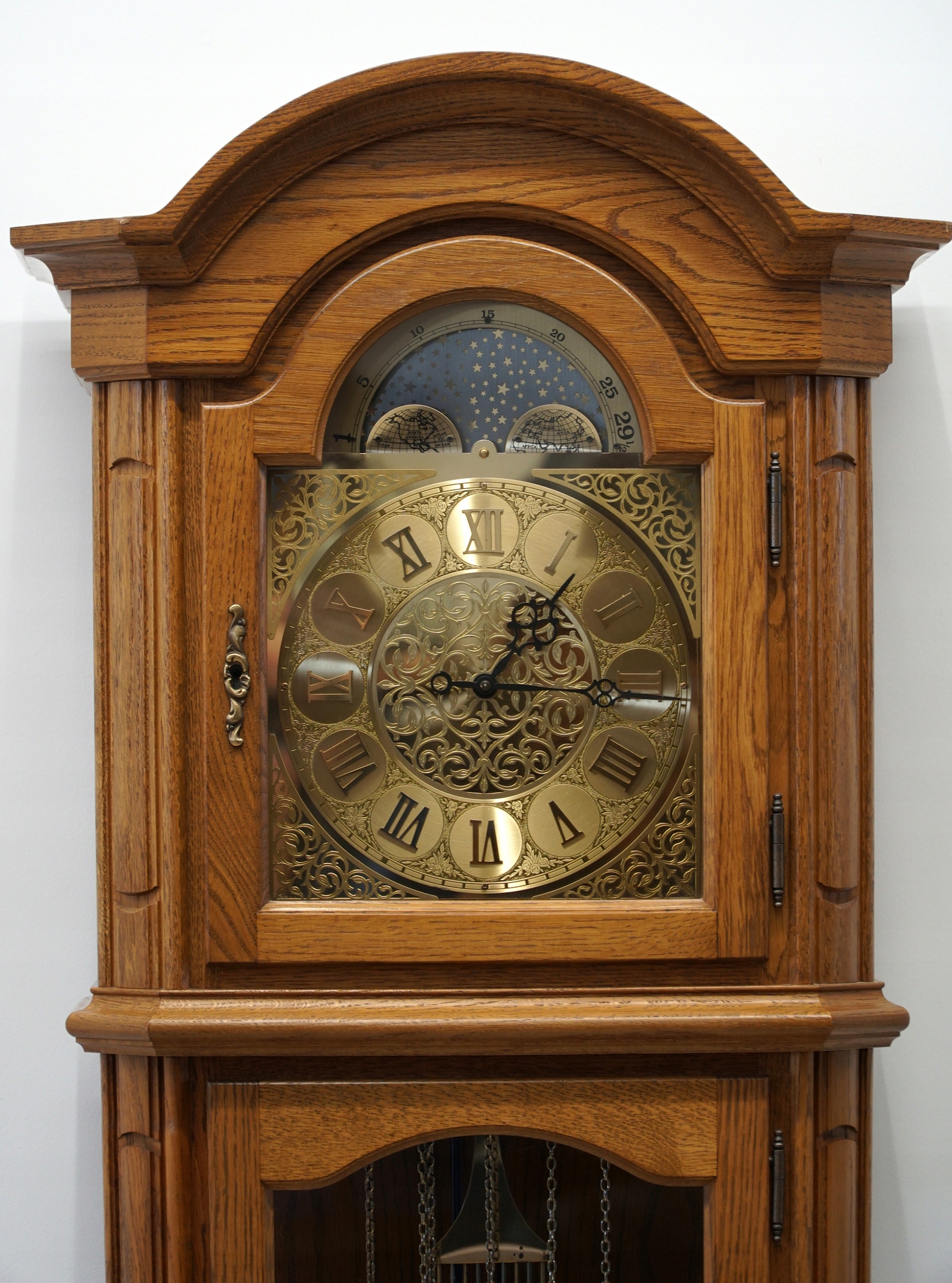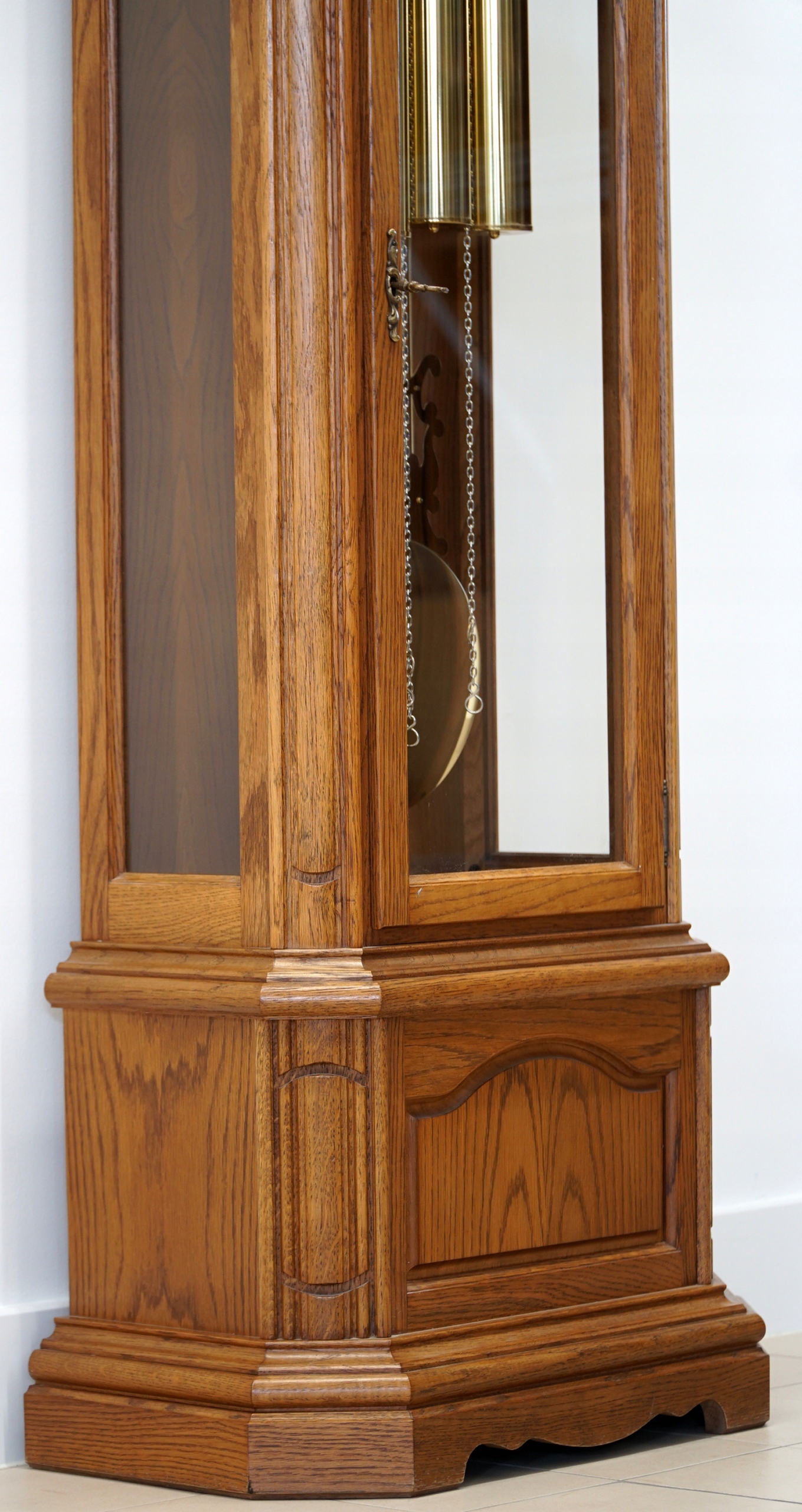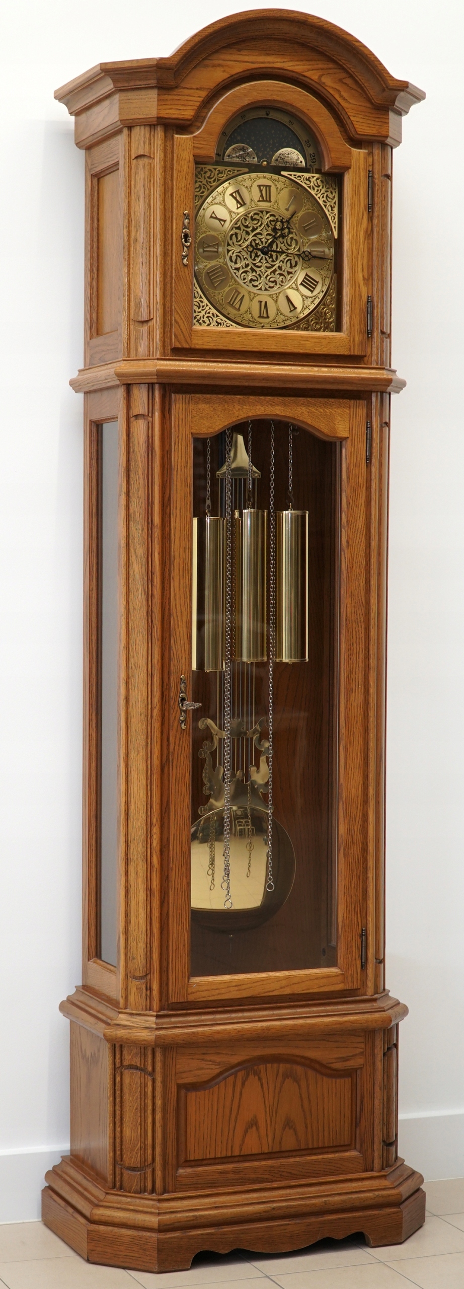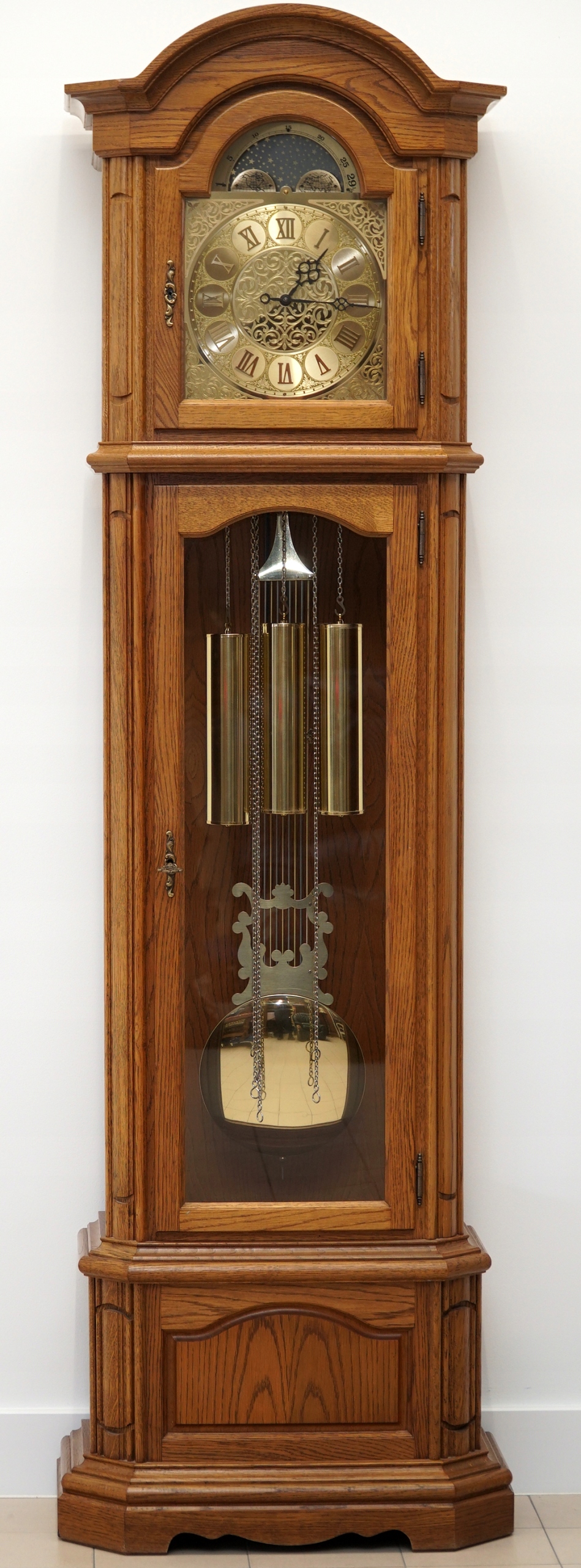 Годинник підлоговий в дубовому корпусі з німецьким механізмом Urgos. Походження Німеччина. 3-важковий механізм, з'єднаний з маятником. 8 рядок. фази місяця. Відрізняється глибоким тоном.