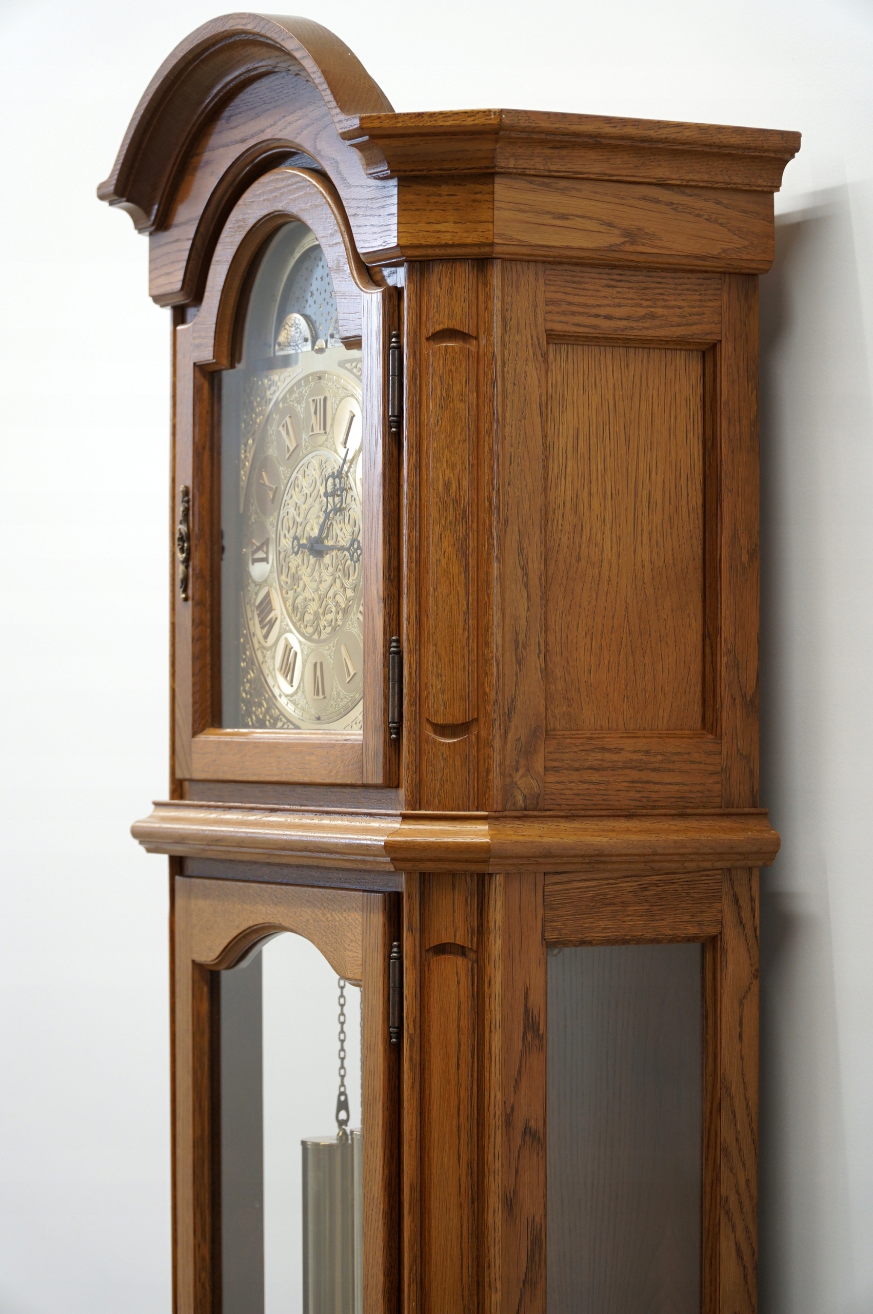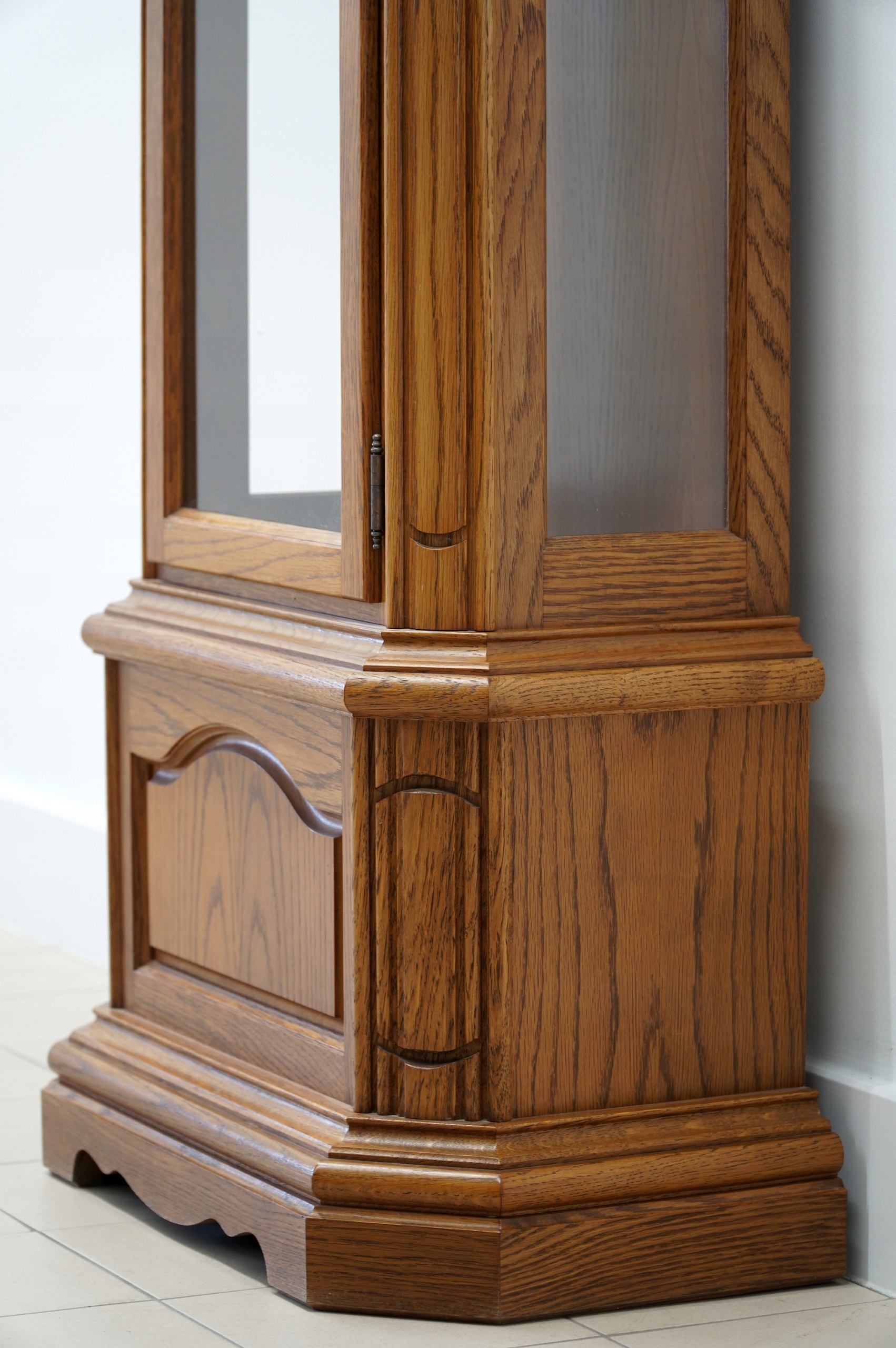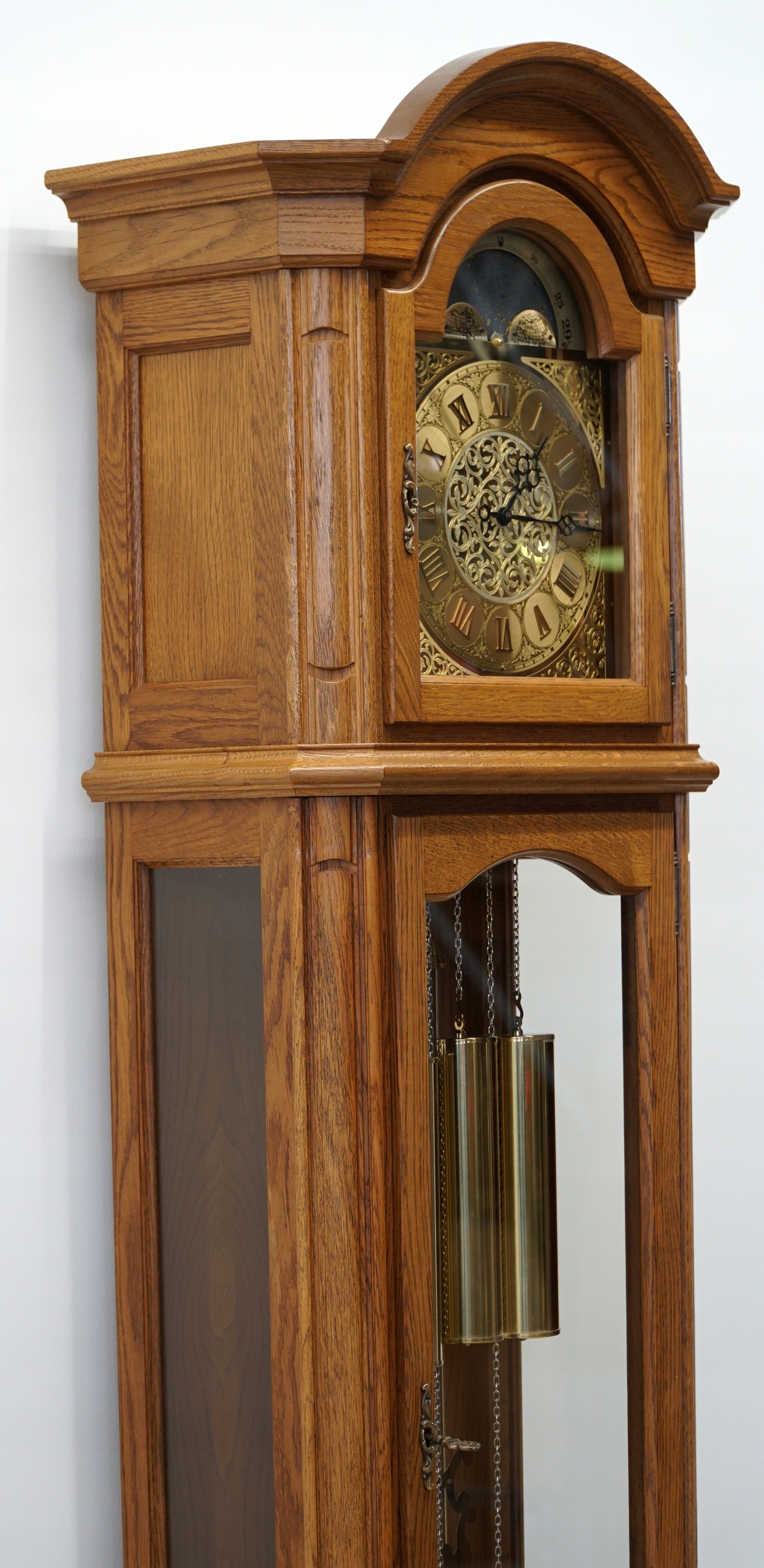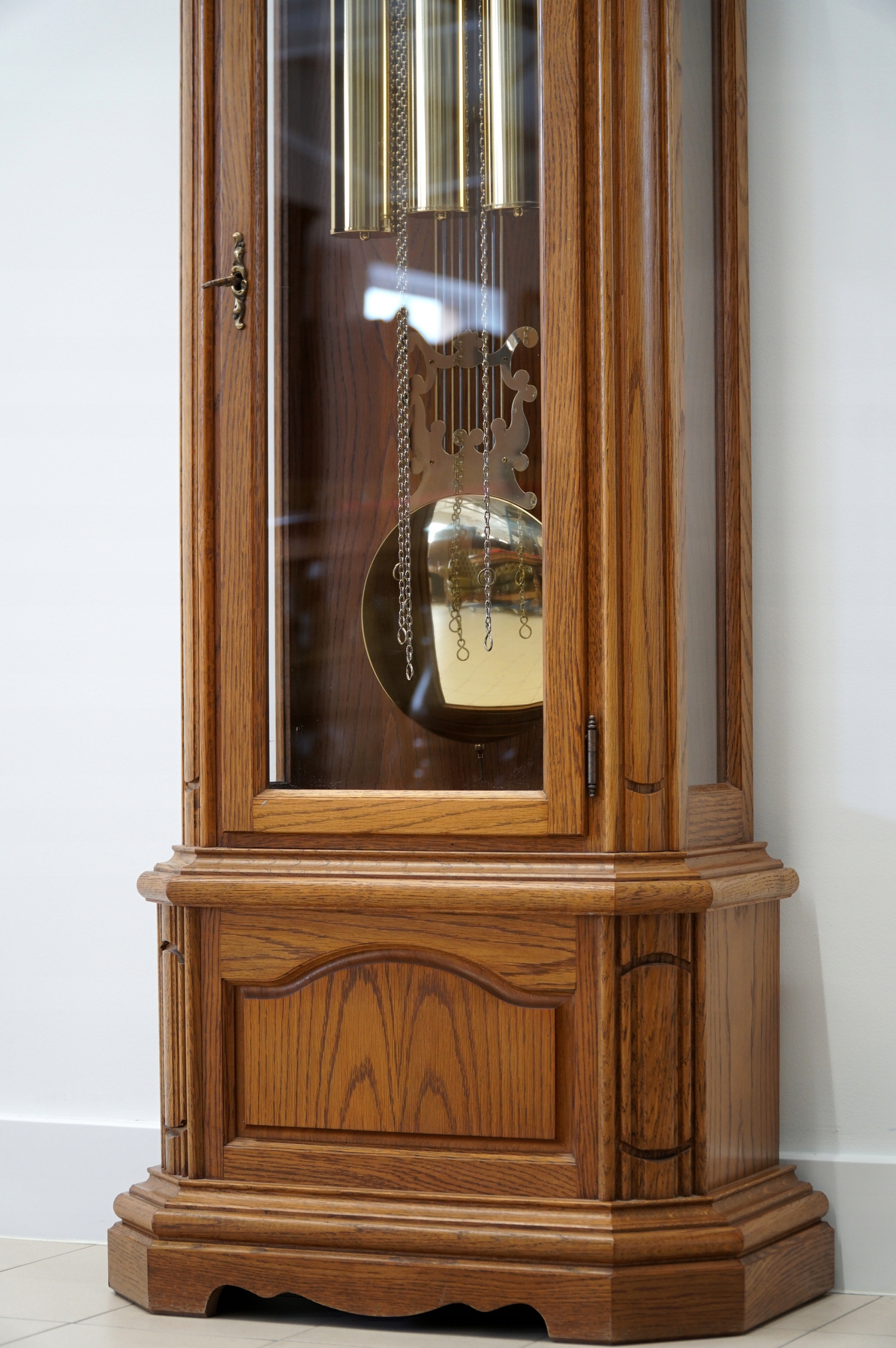 Годинник підлоговий в дубовому корпусі з німецьким механізмом Urgos. Походження Німеччина. 3-важковий механізм, з'єднаний з маятником. 8 рядок. фази місяця. Відрізняється глибоким тоном.