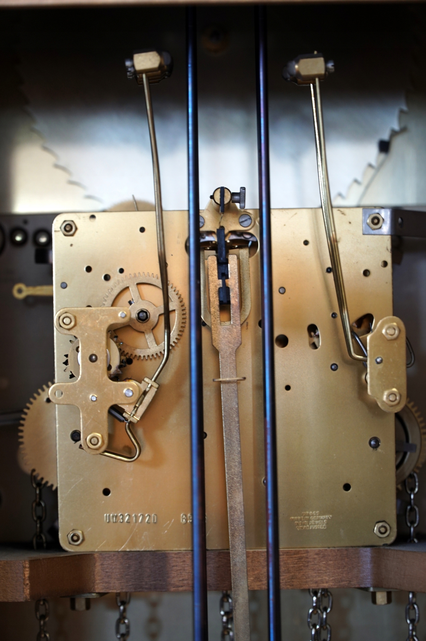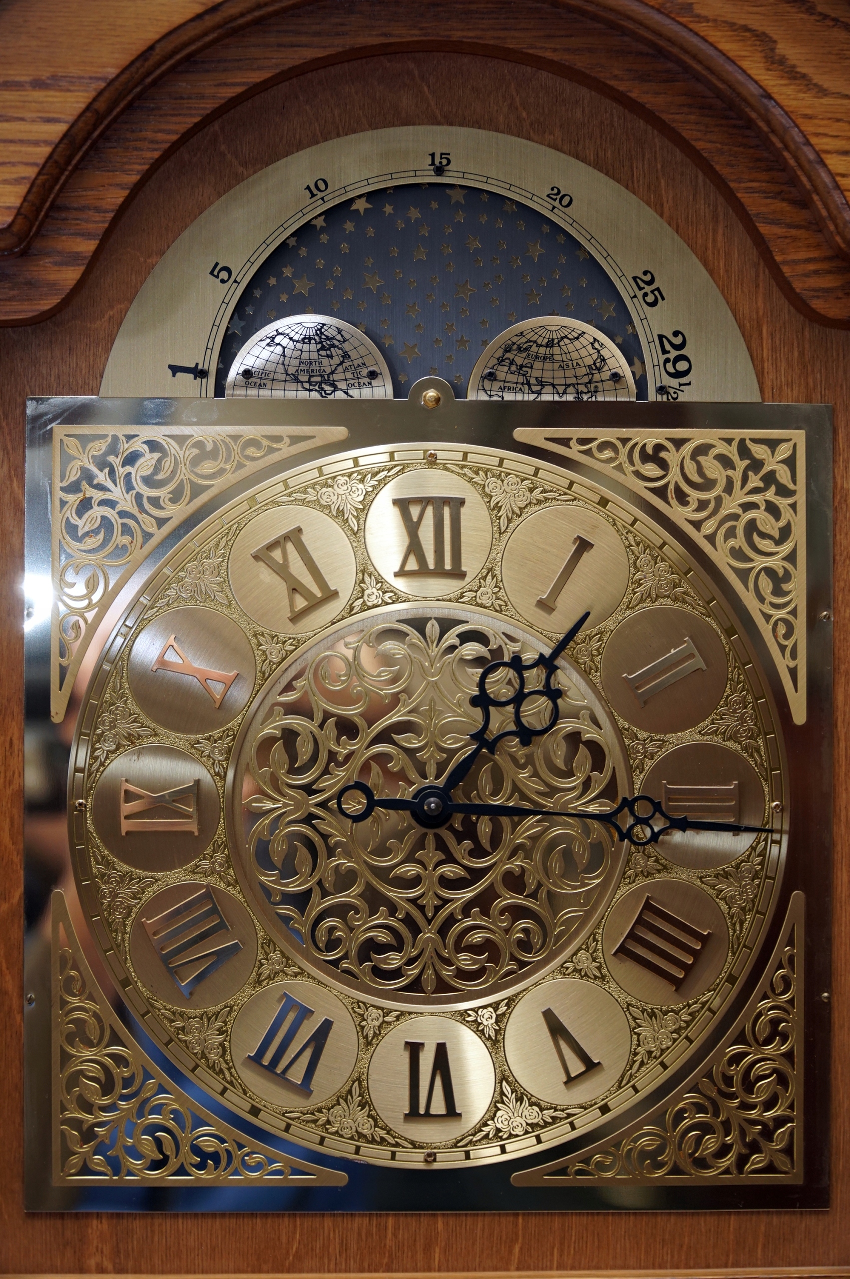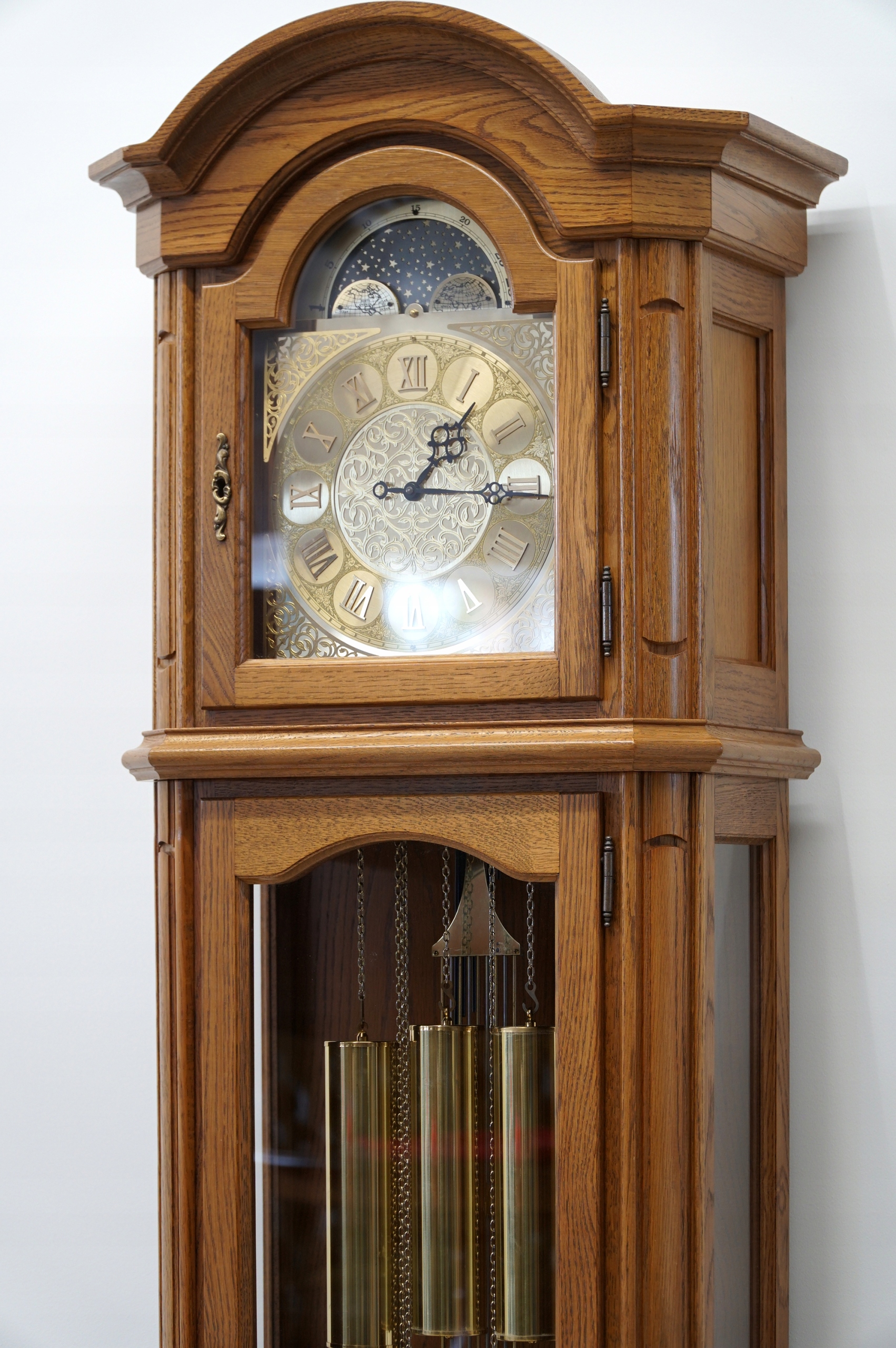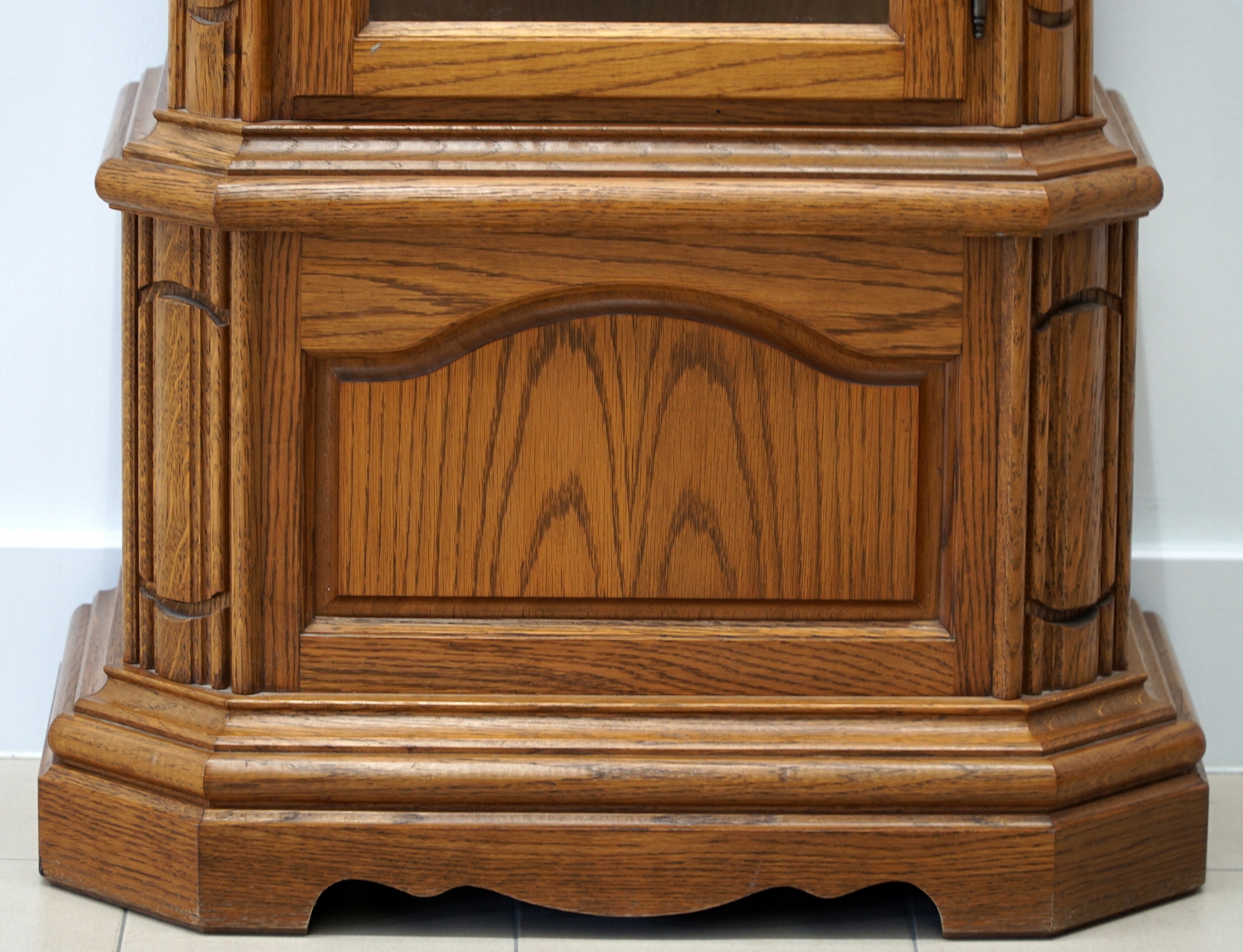 Годинник підлоговий в дубовому корпусі з німецьким механізмом Urgos. Походження Німеччина. 3-важковий механізм, з'єднаний з маятником. 8 рядок. фази місяця. Відрізняється глибоким тоном.