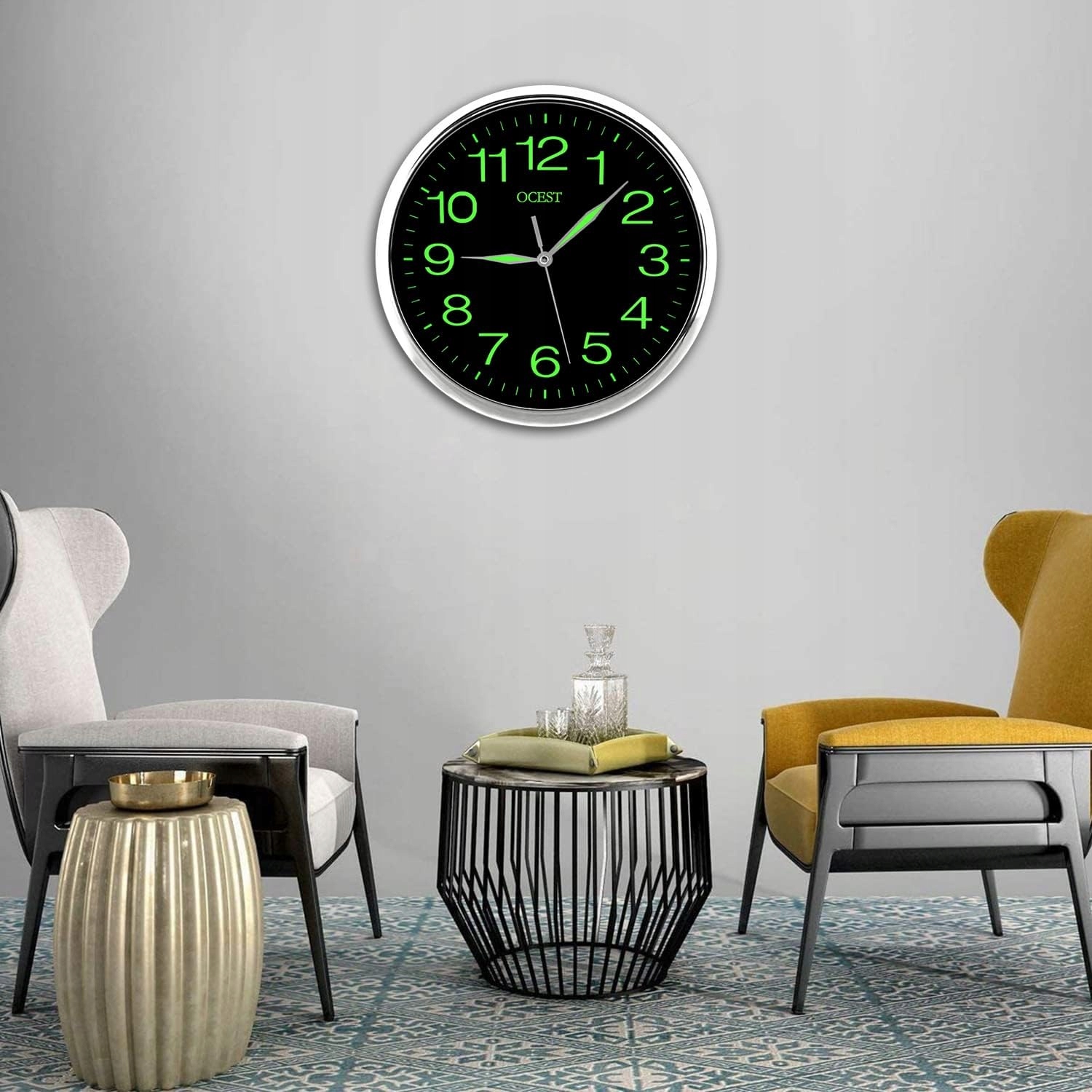 - Настінний годинник, що світиться: цифри та стрілки мають функцію нічного освітлення. Це вимагає поглинання достатньої кількості світла/сонячного світла протягом дня. Уночі він світиться флуоресцентним світлом, тому ви можете бачити його вночі (Поради: годинник світиться в темряві приблизно 3-4 години, час світіння залежить від кількості світла, поглиненого протягом дня).
