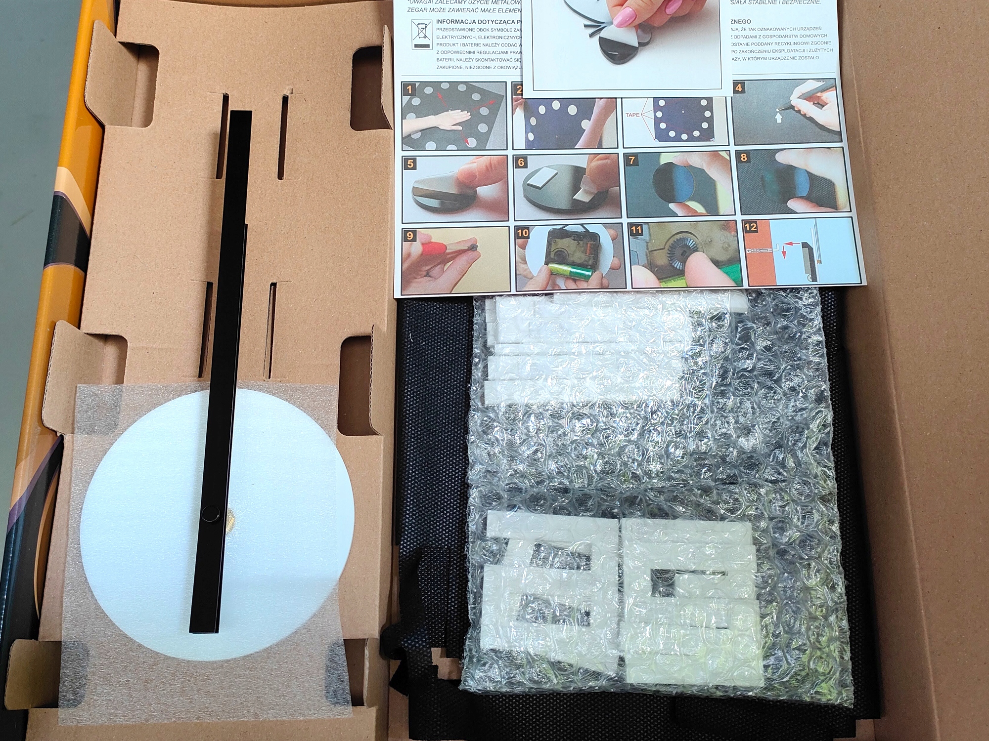Збірка годинника швидка і зручна. Циферблат зі стрілками можна закріпити на гачку. Декоративні елементи кріпляться до стіни за допомогою монтажної стрічки. Кожен елемент проклеюється скотчем. Годинник має шаблон - завдяки йому можна точно розташувати елементи на стіні.
