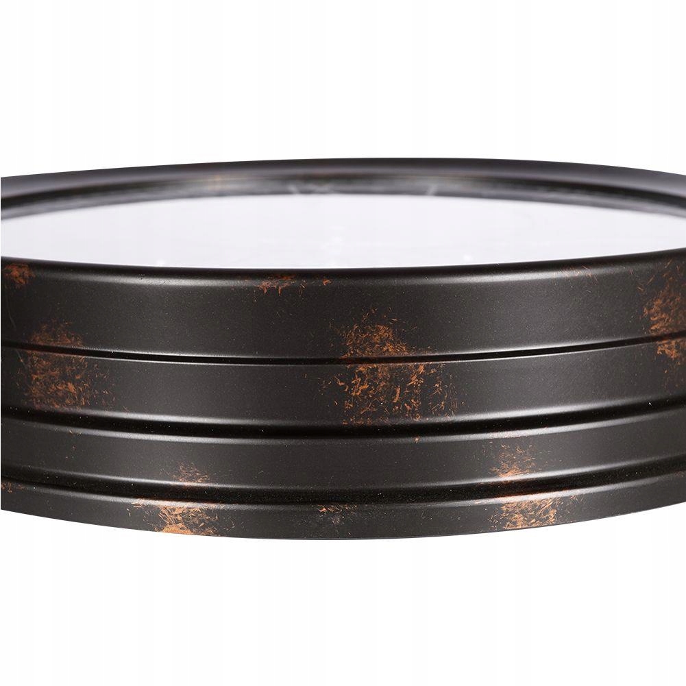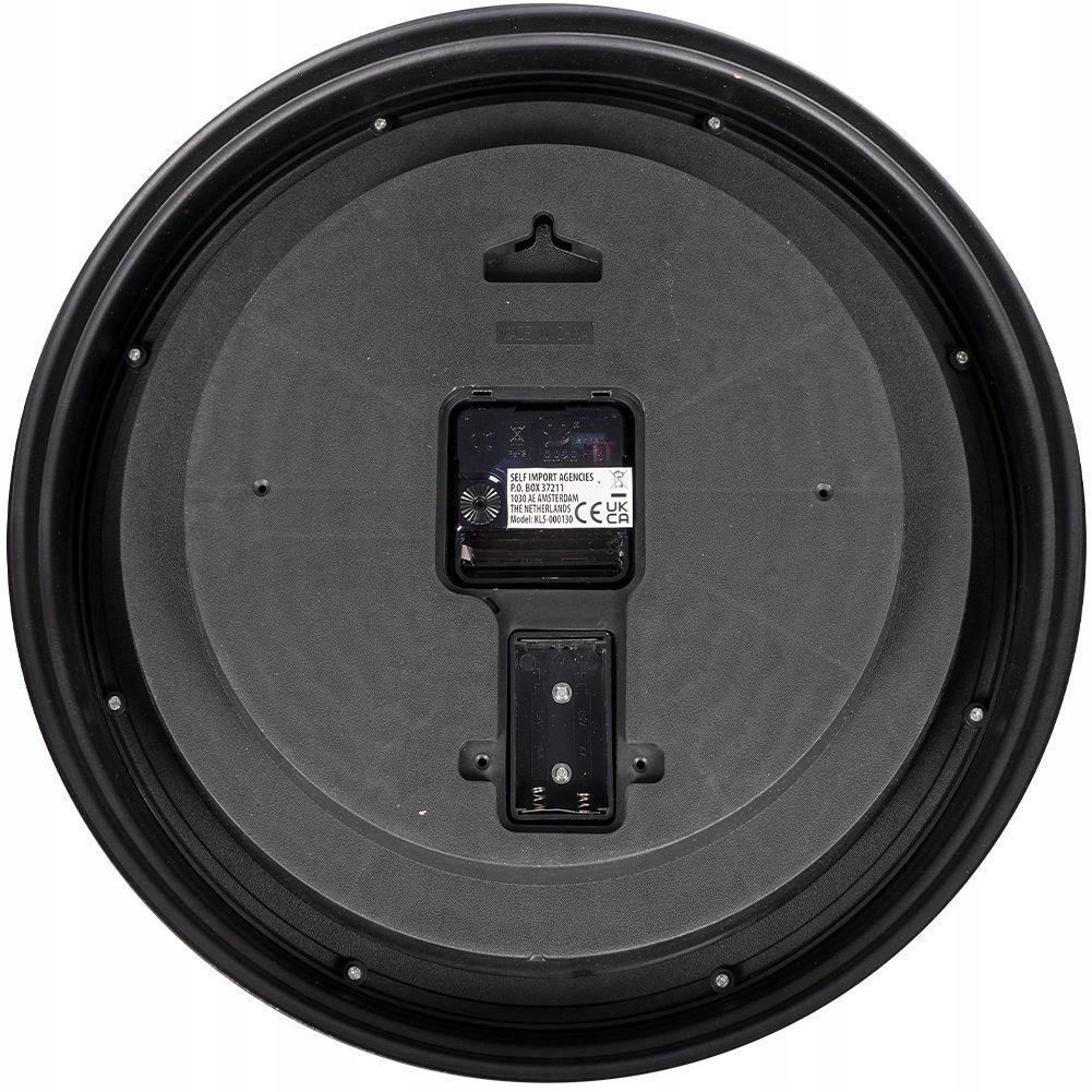 Виготовлений із потертого чорного пластику. На годиннику срібні римські цифри. Фон годинника складається з невеликих, металевих, рухомих срібних циферблатів.