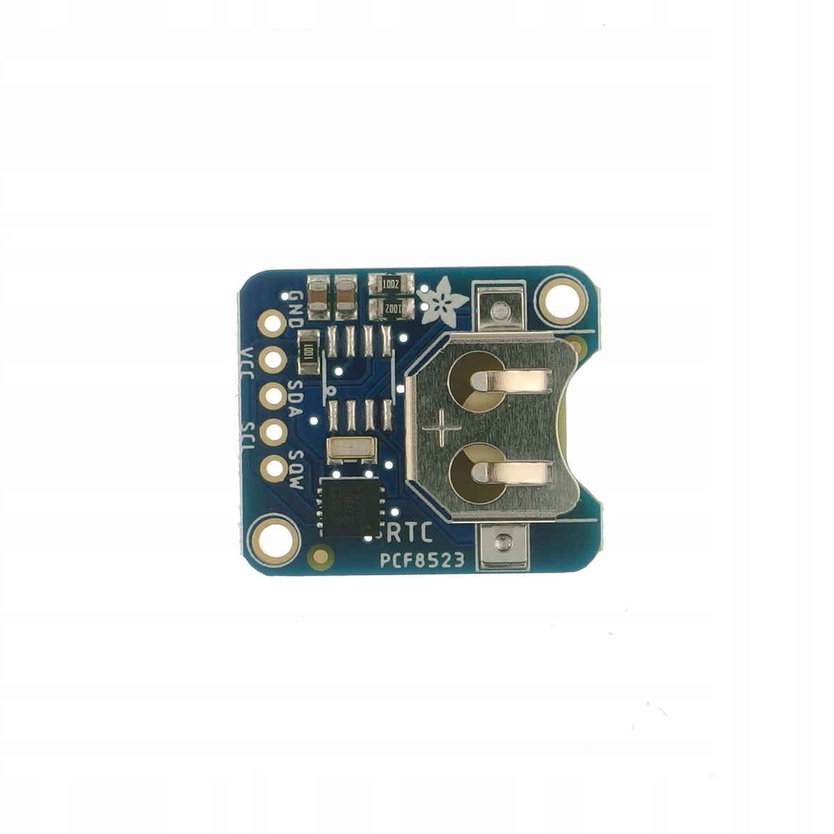 Модуль годинника реального часу (RTC) PCF8523. Він використовує генератор 32,768 кГц і забезпечує точність 2 секунди на день. Годинник рахує секунди, хвилини, години, день місяця, місяць, день тижня та рік з компенсацією високосного року. Має вбудовану програмовану сигналізацію. На платі є гніздо для батарейки CR1220. Він живиться від напруги від 3 В до 5 В, а зв’язок відбувається через інтерфейс I2C. Повна документація доступна на сторінці продукту.