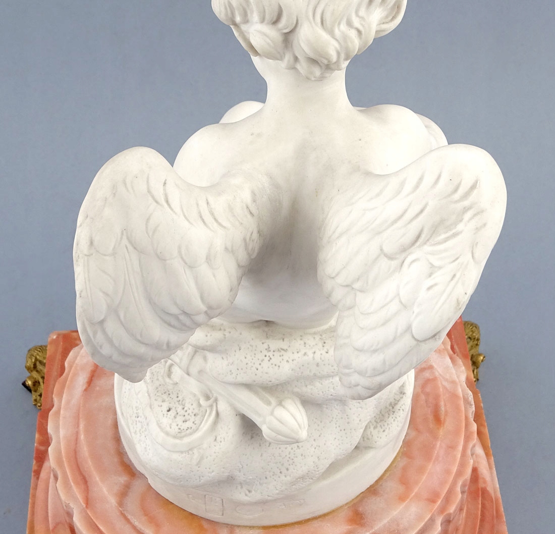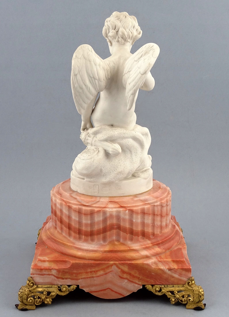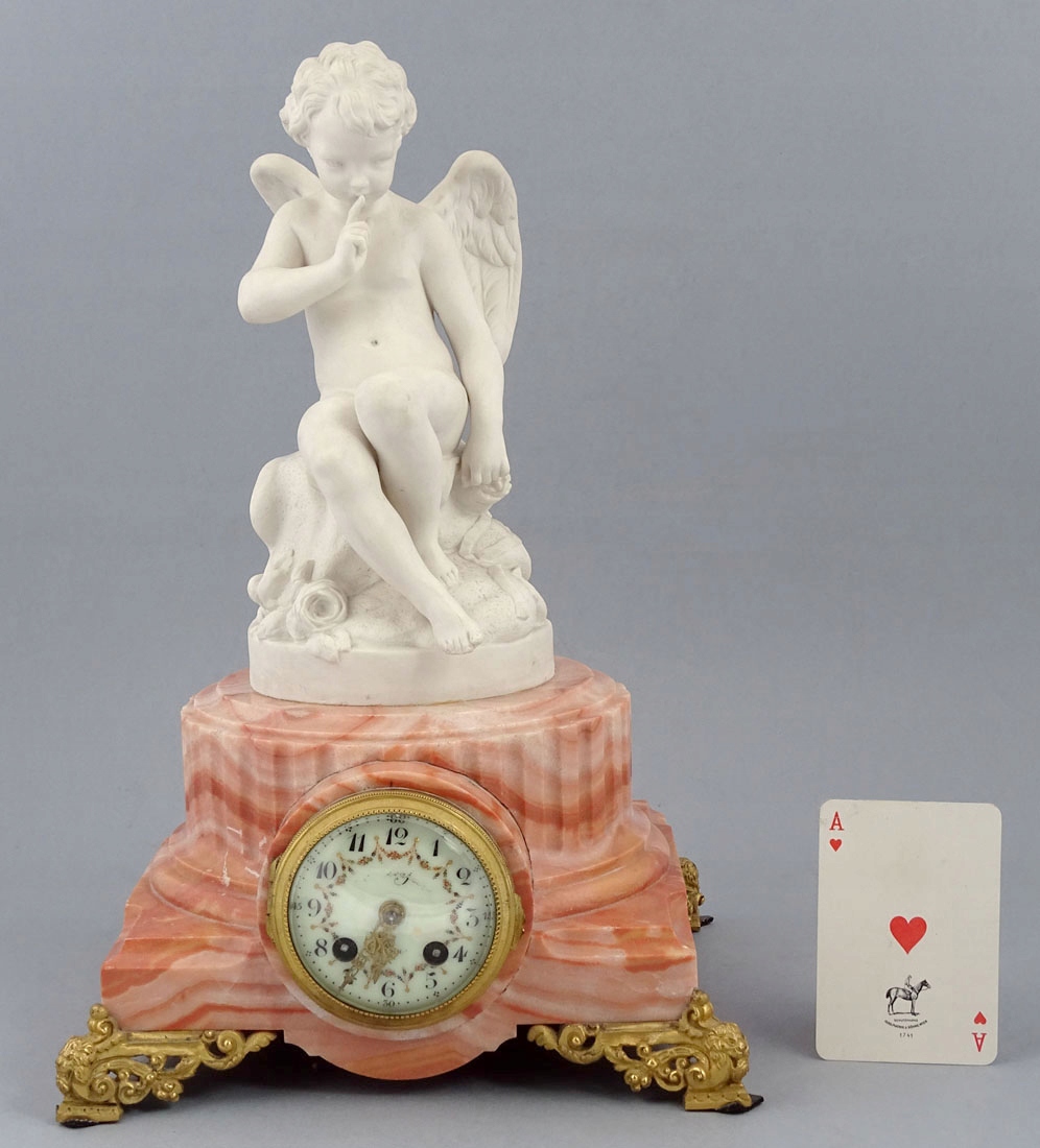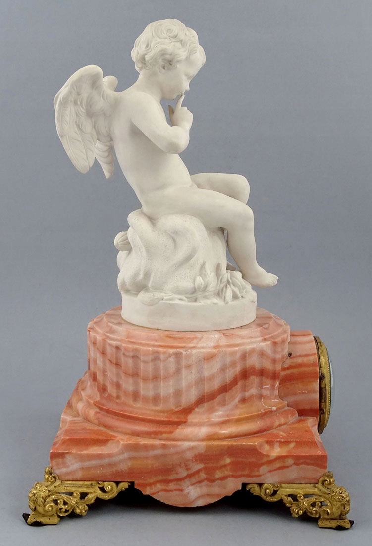 4 Ціле підтримується на чотирьох гравірованих, виготовлених з позолоченої бронзи, відкритих ніжок у вигляді маскарів та овочевих джгутів. Фігура зображує продуману Купідь, що сидить на камені, з трояндою біля ніг і тихою ззаду. Одне з крил знову застряг. Механізм, розміщений у мармуровому рукаві, зі склом, круглим закриттям. Порцеляновий диск з барвистими квітковими гірляндами, чорними арабськими номерами та порадами з відкритих робіт. Механізм функціональний, з повноцінною та напівгранною системою побиття та ключем до обмотки. На тілі зсередини, печатка Vincenti & Cie Medaille d'Argent 1855.