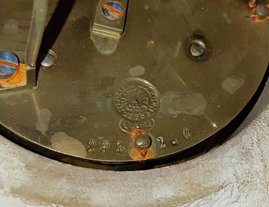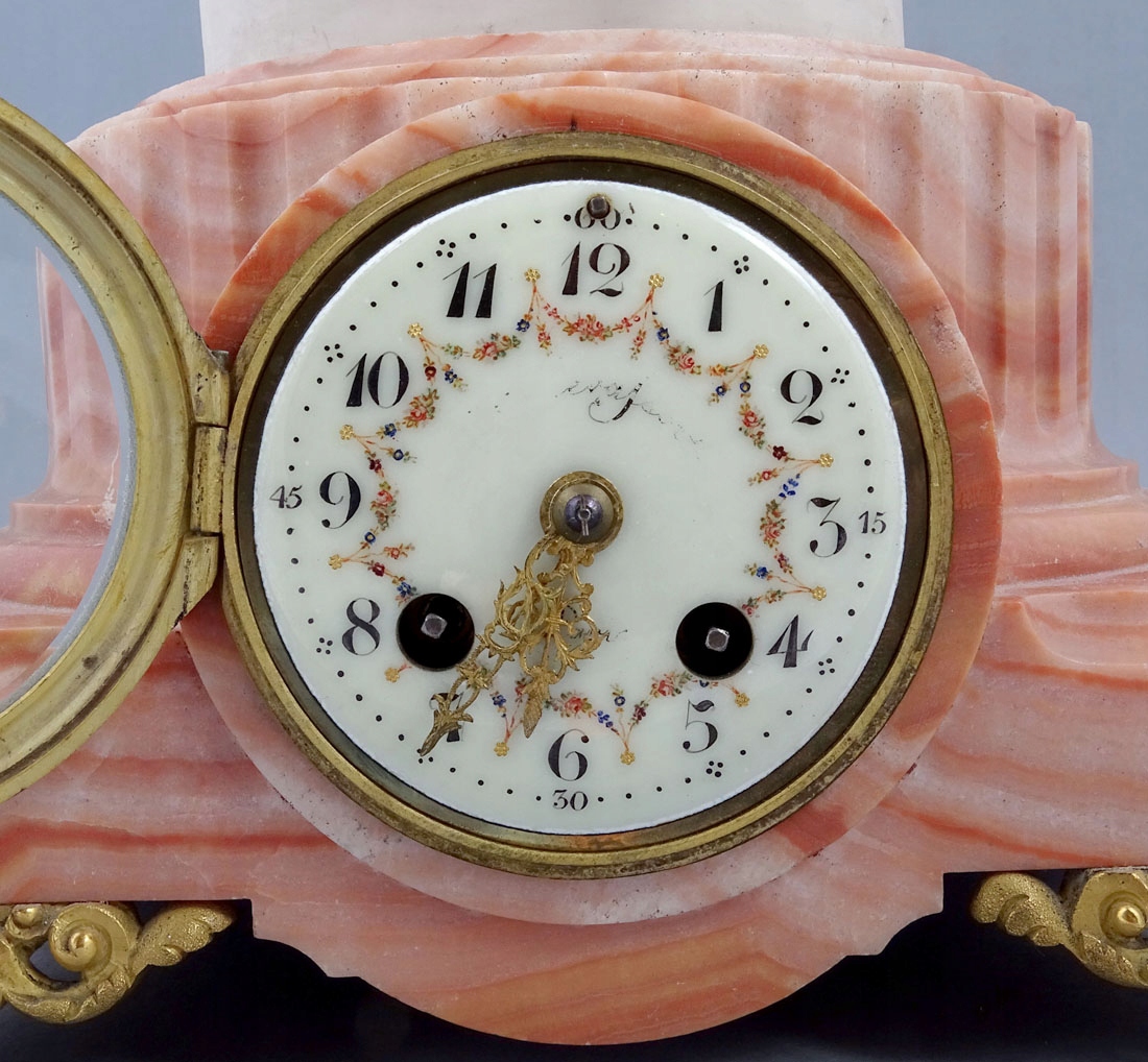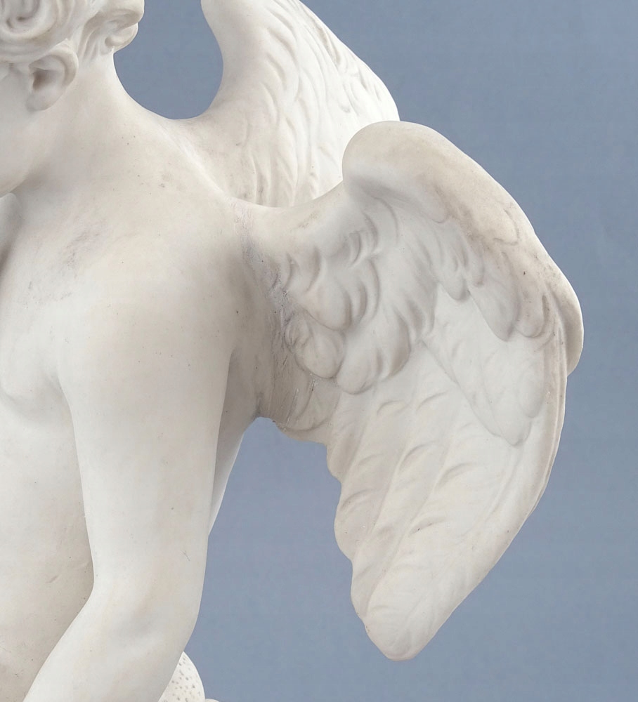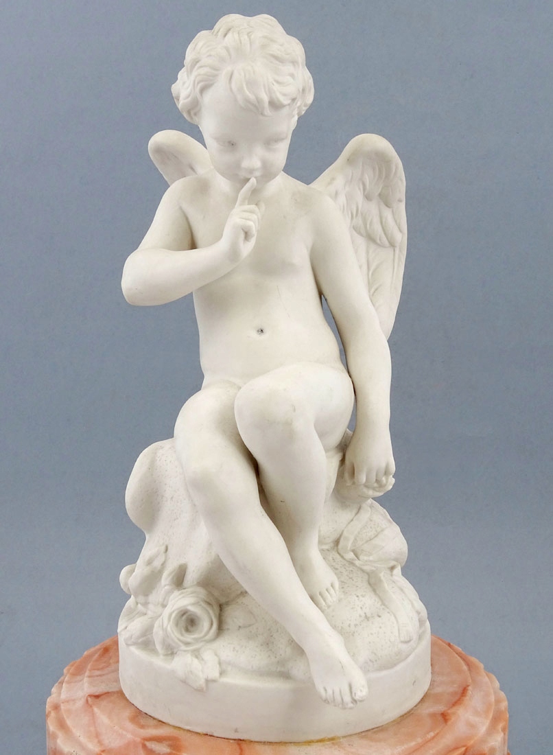 4 Ціле підтримується на чотирьох гравірованих, виготовлених з позолоченої бронзи, відкритих ніжок у вигляді маскарів та овочевих джгутів. Фігура зображує продуману Купідь, що сидить на камені, з трояндою біля ніг і тихою ззаду. Одне з крил знову застряг. Механізм, розміщений у мармуровому рукаві, зі склом, круглим закриттям. Порцеляновий диск з барвистими квітковими гірляндами, чорними арабськими номерами та порадами з відкритих робіт. Механізм функціональний, з повноцінною та напівгранною системою побиття та ключем до обмотки. На тілі зсередини, печатка Vincenti & Cie Medaille d'Argent 1855.