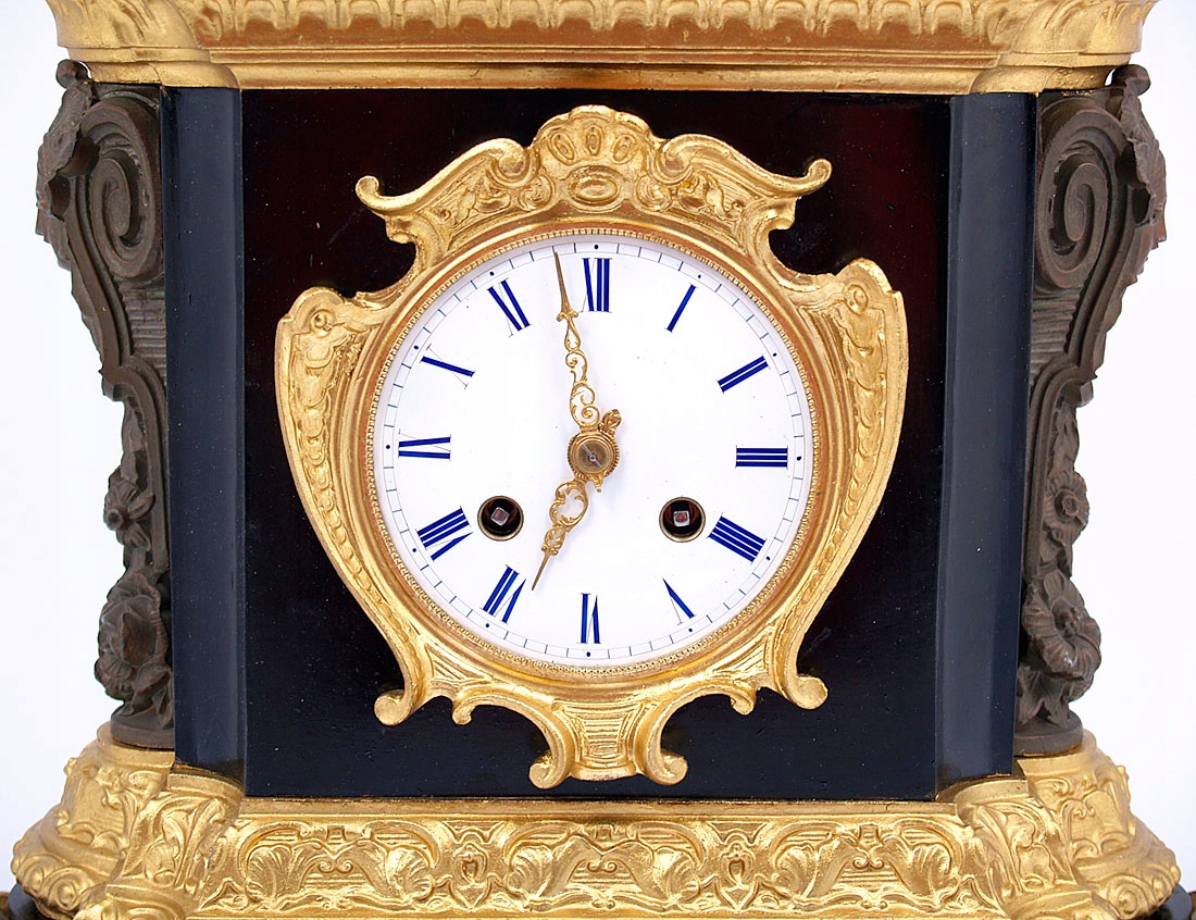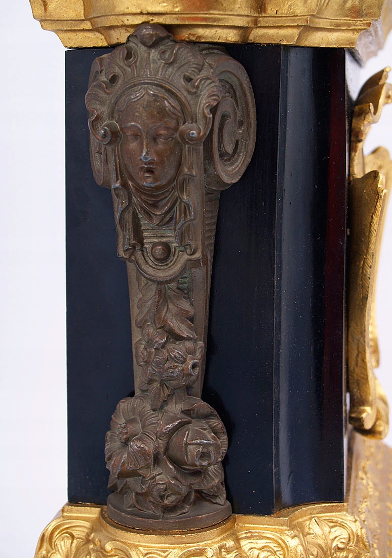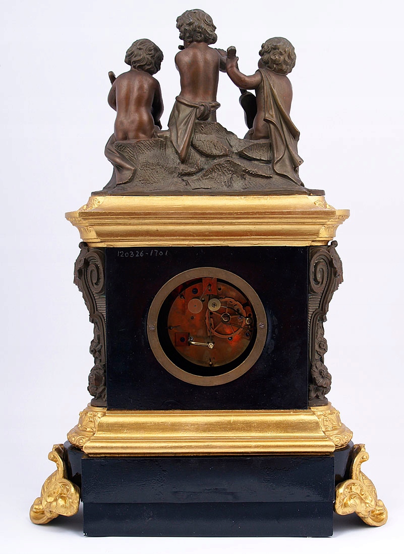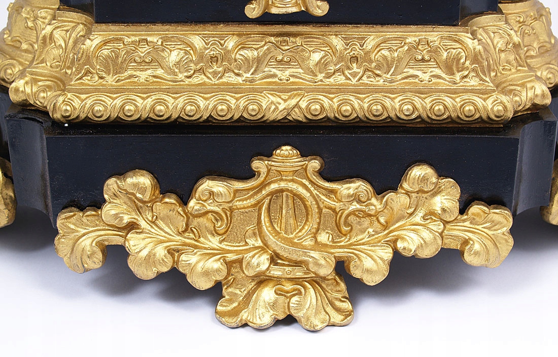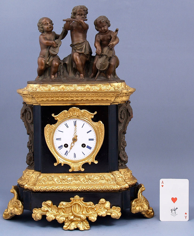 з фігурою, що зображує групу музичних дітей, які грають на мандоліні, флейті та віолончелі. Корпус прямий зі скошеними кутами, чорнений. спереду зверху і знизу широкі різьблені планки у вигляді вусиків рослин, ззаду гладкі. Ніжки у вигляді черепашок з квітковими мотивами та гербами посередині. З боків годинника каріатиди, внизу прикрашені бутонами квітів.