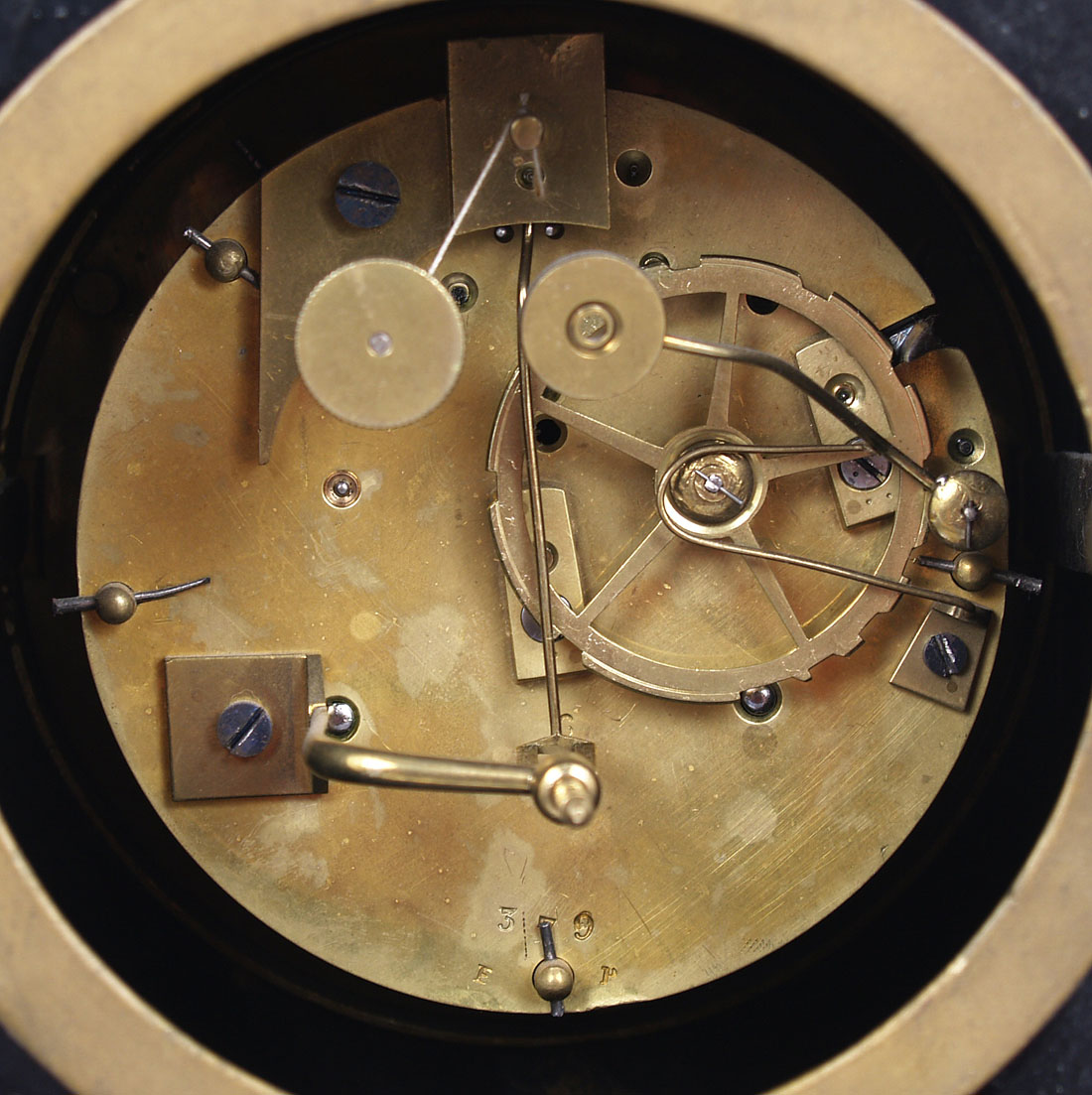 Циферблат годинник емальований з римськими цифрами синього кольору, стрілки ажурні, позолочені. Механізм з системою відбивання годинника та півгодини, з маятником, підвішеним на нитці, дзвіночком та ключем, у робочому стані.