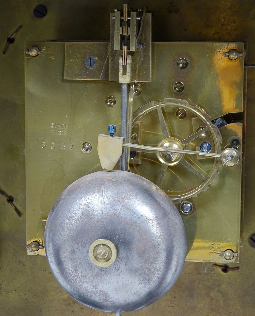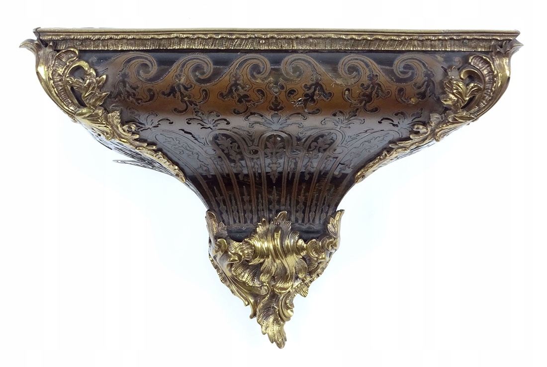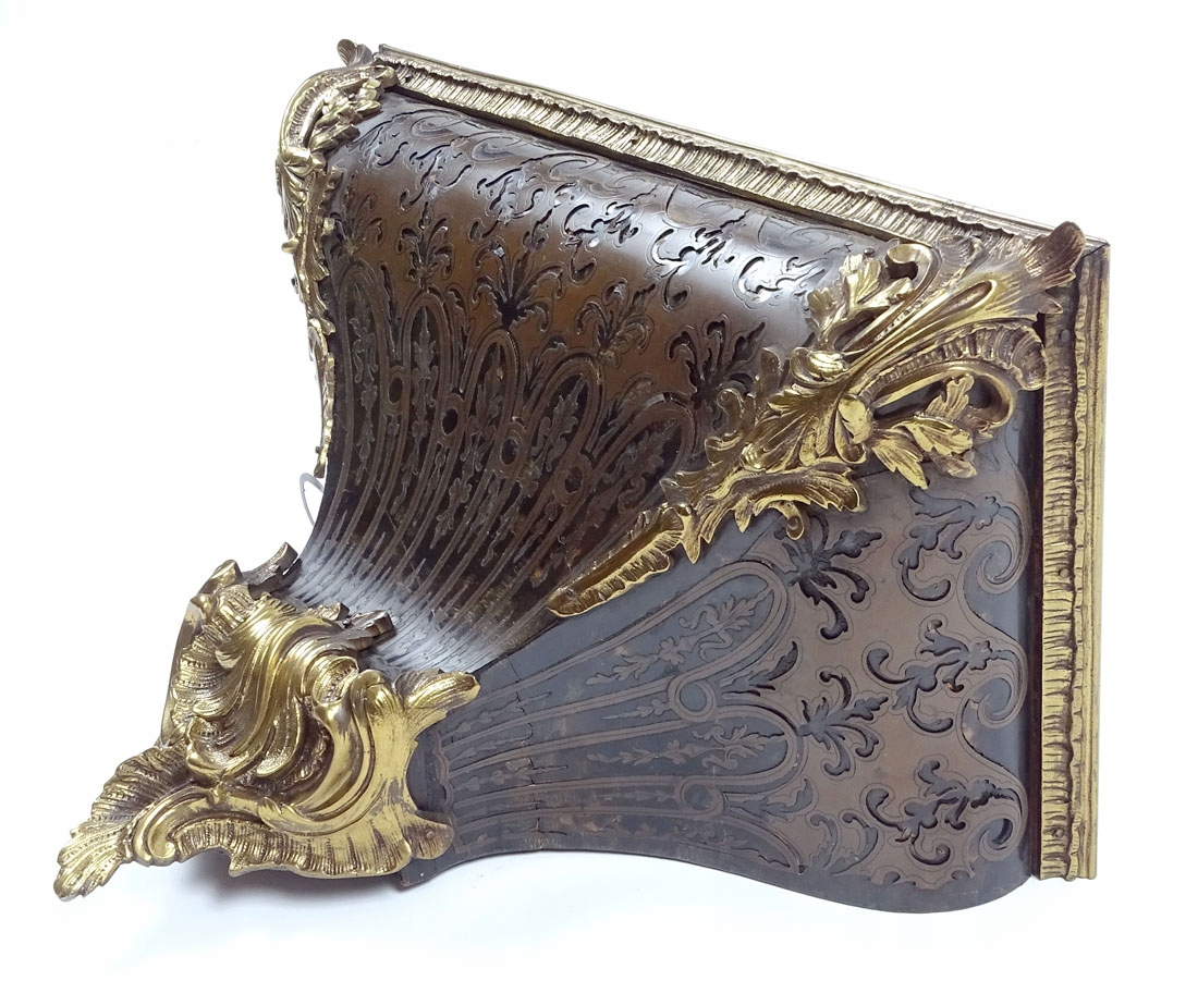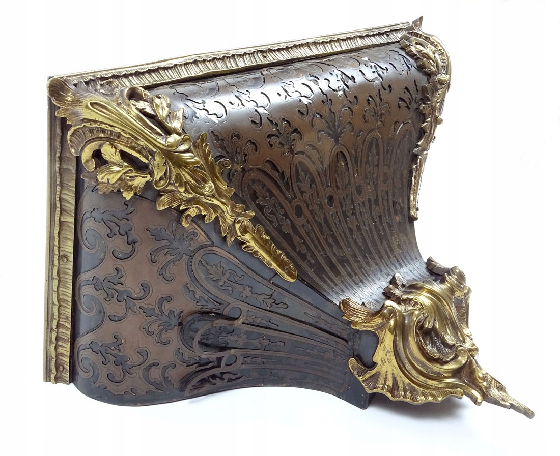 Оригінальна консоль, також прикрашена панциром черепахи та латунним листом, з рослиною і бронзові аплікації спереду, з боків і смуга в завершенні. Емальований циферблат із римськими цифрами годин і хвилин, вигравіруваними по колу. Пружинний механізм із системою відбивання годин і півгодини, зі сталевою чашею дзвона та вигравірованим маятником.