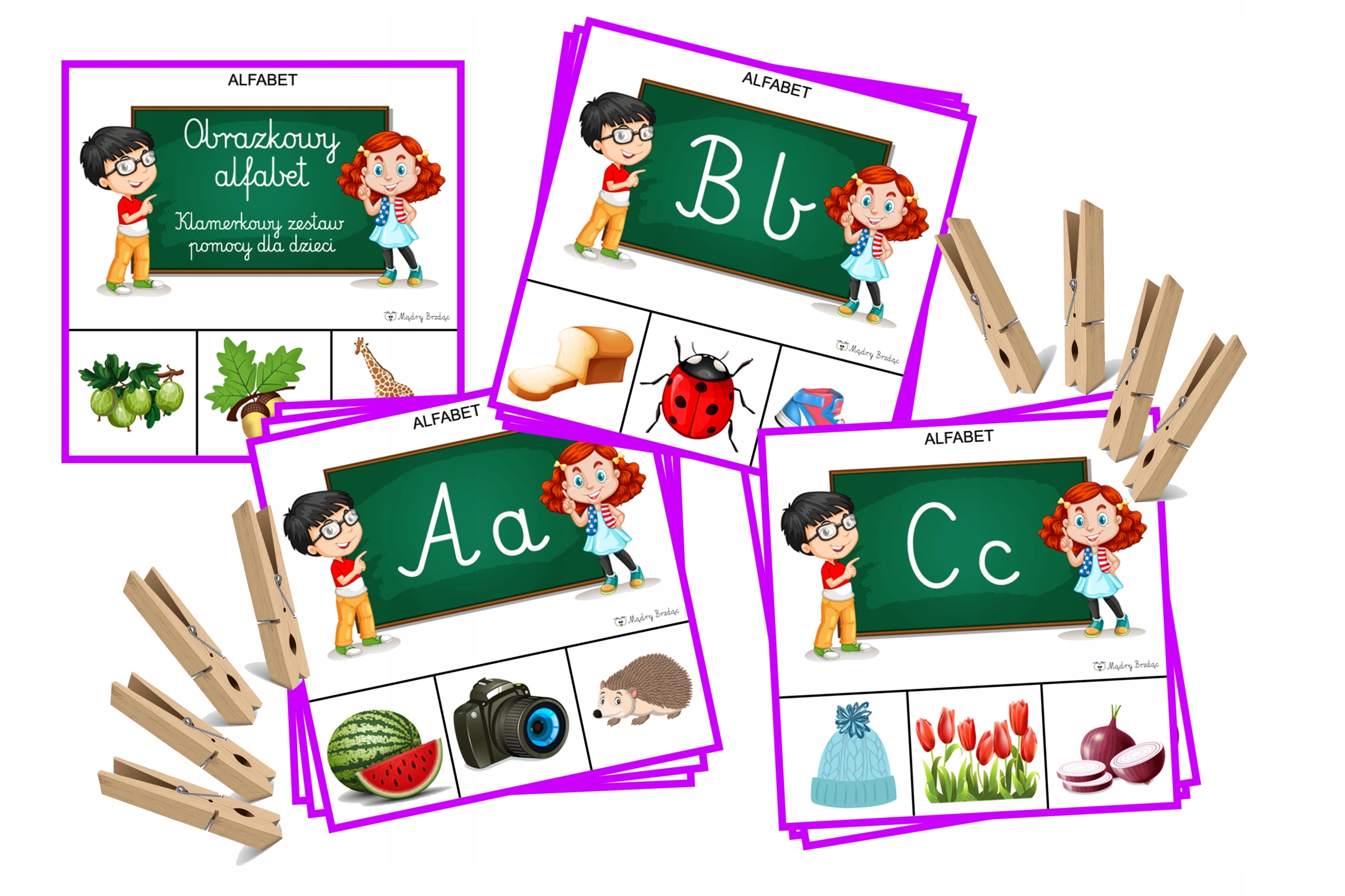На картках є картинки, які починаються на задану букву алфавіту, яку потрібно позначити прищіпкою, одна картинка неправильна.